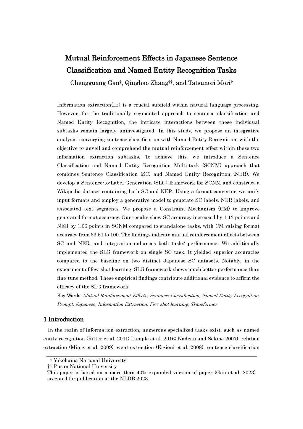 Information extraction(IE) is a crucial subfield within natural language processing. However, for the traditionally segmented approach to sentence classification and Named Entity Recognition, the intricate interactions between these individual subtasks remain largely uninvestigated. In this study, we propose an integrative analysis, converging sentence classification with Named Entity Recognition, with the objective to unveil and comprehend the mutual reinforcement effect within these two information extraction subtasks. To achieve this, we introduce a Sentence Classification and Named Entity Recognition Multi-task (SCNM) approach that combines Sentence Classification (SC) and Named Entity Recognition (NER). We develop a Sentence-to-Label Generation (SLG) framework for SCNM and construct a Wikipedia dataset containing both SC and NER. Using a format converter, we unify input formats and employ a generative model to generate SC-labels, NER-labels, and associated text segments. We propose a Constraint Mechanism (CM) to improve generated format accuracy. Our results show SC accuracy increased by 1.13 points and NER by 1.06 points in SCNM compared to standalone tasks, with CM raising format accuracy from 63.61 to 100. The findings indicate mutual reinforcement effects between SC and NER, and integration enhances both tasks' performance. We additionally implemented the SLG framework on single SC task. It yielded superior accuracies compared to the baseline on two distinct Japanese SC datasets. Notably, in the experiment of few-shot learning, SLG framework shows much better performance than fine-tune method. These empirical findings contribute additional evidence to affirm the efficacy of the SLG framework.