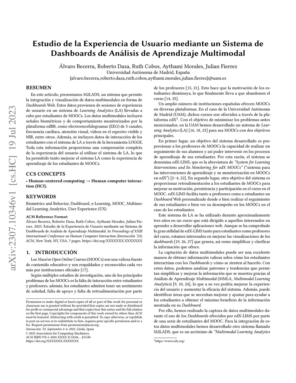 In the article, we present a Web-based System called M2LADS, which supports the integration and visualization of multimodal data recorded in user experiences (UX) in a Learning Analytics (LA) system in the form of Web-based Dashboards. Based on the edBB platform, the multimodal data gathered contains biometric and behavioral signals including electroencephalogram data to measure learners' cognitive attention, heart rate for affective measures and visual attention from the video recordings. Additionally, learners' static background data and their learning performance measures are tracked using LOGGE tool. M2LADS provides opportunities to capture learners' holistic experience during their interactions with the learning analytic system in order to improve the system and the user experience of the learners. -- En este art\ículo, presentamos M2LADS, un sistema que permite la integraci\ón y visualizaci\ón de datos multimodales en forma de Dashboards Web. Estos datos provienen de sesiones de experiencia de usuario en un sistema de Learning Analytics (LA) llevadas a cabo por estudiantes de MOOCs. Los datos multimodales incluyen se\~nales biom\étricas y de comportamiento monitorizados por la plataforma edBB, como electroencefalogramas (EEG) de 5 canales, frecuencia card\íaca, atenci\ón visual, videos en el espectro visible y NIR, entre otros. Adem\ás, se incluyen datos de interacci\ón de los estudiantes con el sistema de LA a trav\és de la herramienta LOGGE. Toda esta informaci\ón proporciona una comprensi\ón completa de la experiencia del usuario al utilizar el sistema de LA, lo que ha permitido tanto mejorar el sistema LA como la experiencia de aprendizaje de los estudiantes de MOOCs.