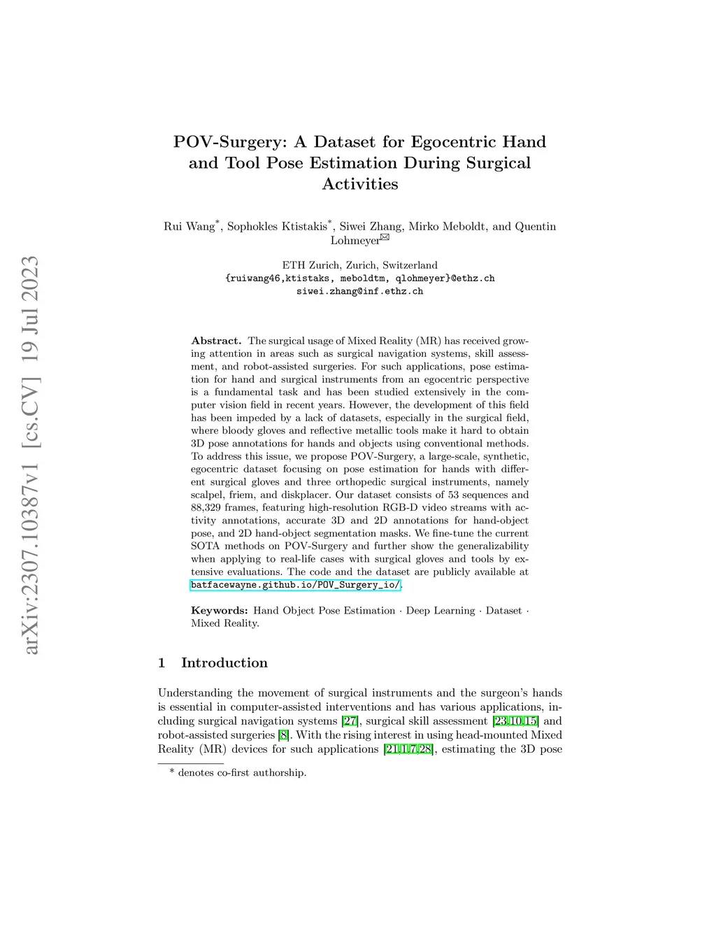 POV-Surgery: A Dataset for Egocentric Hand and Tool Pose Estimation