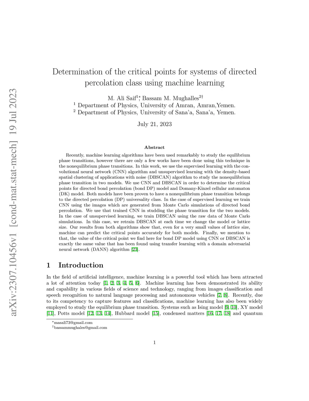 Recently, machine learning algorithms have been used remarkably to study the equilibrium phase transitions, however there are only a few works have been done using this technique in the nonequilibrium phase transitions. In this work, we use the supervised learning with the convolutional neural network (CNN) algorithm and unsupervised learning with the density-based spatial clustering of applications with noise (DBSCAN) algorithm to study the nonequilibrium phase transition in two models. We use CNN and DBSCAN in order to determine the critical points for directed bond percolation (bond DP) model and Domany-Kinzel cellular automaton (DK) model. Both models have been proven to have a nonequilibrium phase transition belongs to the directed percolation (DP) universality class. In the case of supervised learning we train CNN using the images which are generated from Monte Carlo simulations of directed bond percolation. We use that trained CNN in studding the phase transition for the two models. In the case of unsupervised learning, we train DBSCAN using the raw data of Monte Carlo simulations. In this case, we retrain DBSCAN at each time we change the model or lattice size. Our results from both algorithms show that, even for a very small values of lattice size, machine can predict the critical points accurately for both models. Finally, we mention to that, the value of the critical point we find here for bond DP model using CNN or DBSCAN is exactly the same value that has been found using transfer learning with a domain adversarial neural network (DANN) algorithm.