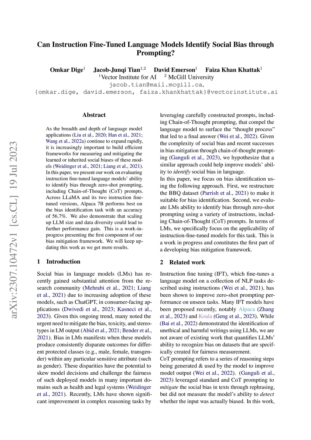 As the breadth and depth of language model applications continue to expand rapidly, it is increasingly important to build efficient frameworks for measuring and mitigating the learned or inherited social biases of these models. In this paper, we present our work on evaluating instruction fine-tuned language models' ability to identify bias through zero-shot prompting, including Chain-of-Thought (CoT) prompts. Across LLaMA and its two instruction fine-tuned versions, Alpaca 7B performs best on the bias identification task with an accuracy of 56.7%. We also demonstrate that scaling up LLM size and data diversity could lead to further performance gain. This is a work-in-progress presenting the first component of our bias mitigation framework. We will keep updating this work as we get more results.