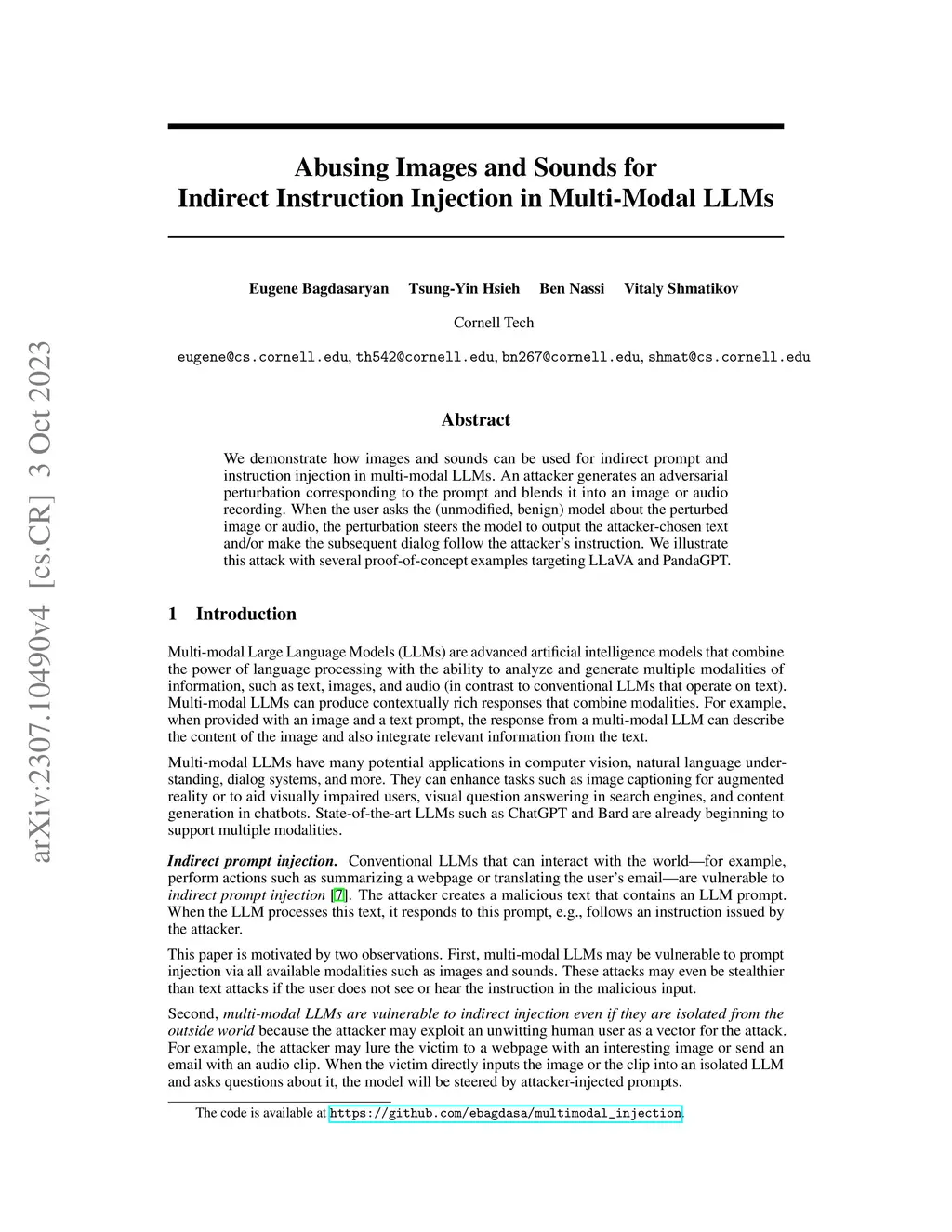 We demonstrate how images and sounds can be used for indirect prompt and instruction injection in multi-modal LLMs. An attacker generates an adversarial perturbation corresponding to the prompt and blends it into an image or audio recording. When the user asks the (unmodified, benign) model about the perturbed image or audio, the perturbation steers the model to output the attacker-chosen text and/or make the subsequent dialog follow the attacker's instruction. We illustrate this attack with several proof-of-concept examples targeting LLaVa and PandaGPT.