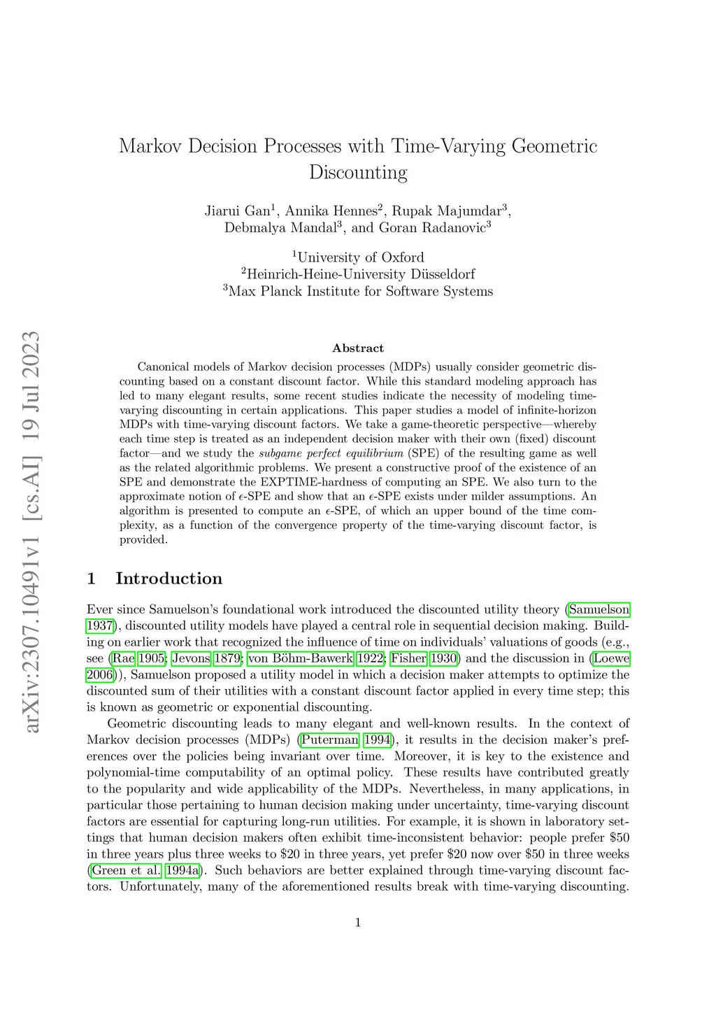 Canonical models of Markov decision processes (MDPs) usually consider geometric discounting based on a constant discount factor. While this standard modeling approach has led to many elegant results, some recent studies indicate the necessity of modeling time-varying discounting in certain applications. This paper studies a model of infinite-horizon MDPs with time-varying discount factors. We take a game-theoretic perspective -- whereby each time step is treated as an independent decision maker with their own (fixed) discount factor -- and we study the subgame perfect equilibrium (SPE) of the resulting game as well as the related algorithmic problems. We present a constructive proof of the existence of an SPE and demonstrate the EXPTIME-hardness of computing an SPE. We also turn to the approximate notion of -SPE and show that an -SPE exists under milder assumptions. An algorithm is presented to compute an -SPE, of which an upper bound of the time complexity, as a function of the convergence property of the time-varying discount factor, is provided.