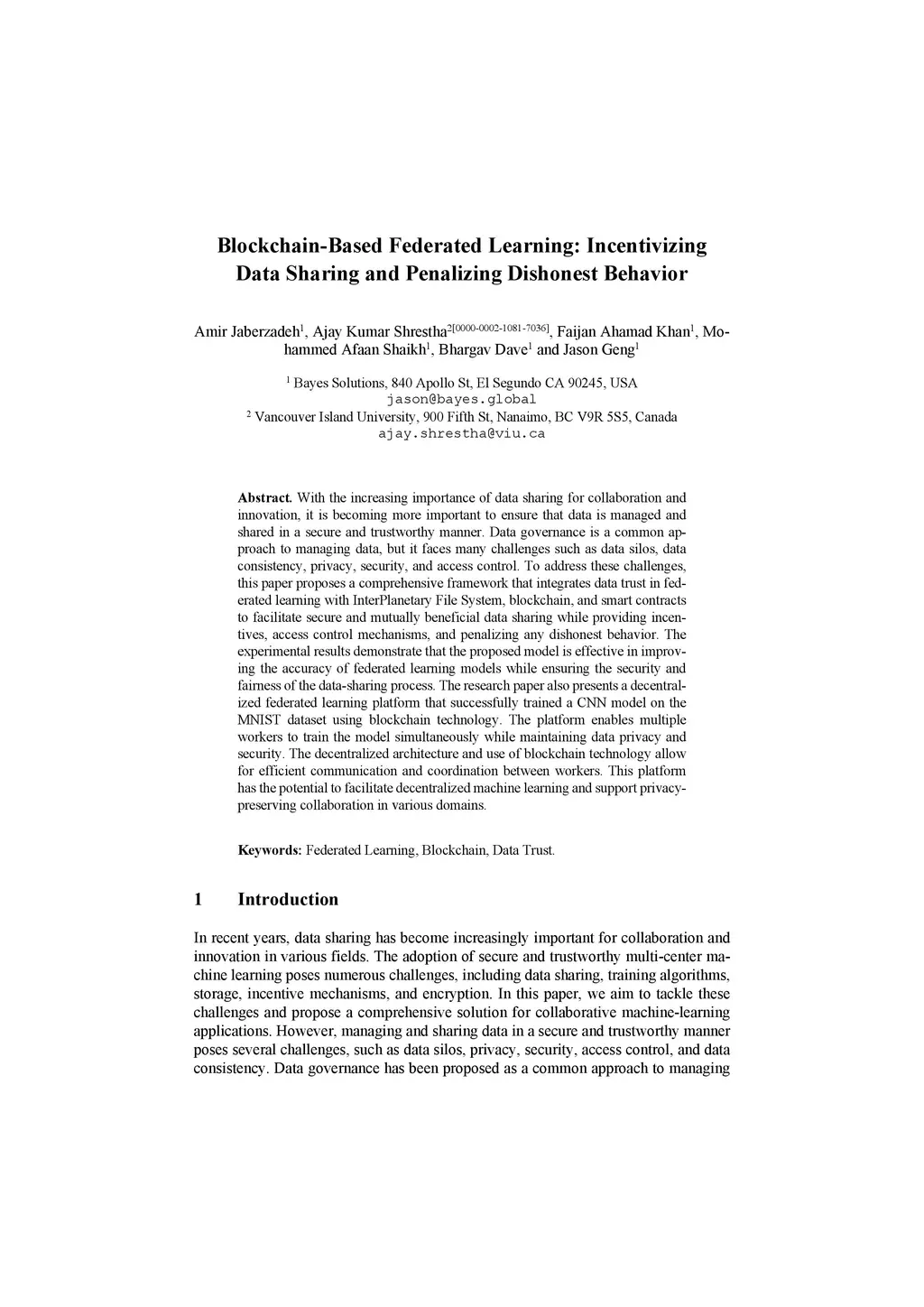 With the increasing importance of data sharing for collaboration and innovation, it is becoming more important to ensure that data is managed and shared in a secure and trustworthy manner. Data governance is a common approach to managing data, but it faces many challenges such as data silos, data consistency, privacy, security, and access control. To address these challenges, this paper proposes a comprehensive framework that integrates data trust in federated learning with InterPlanetary File System, blockchain, and smart contracts to facilitate secure and mutually beneficial data sharing while providing incentives, access control mechanisms, and penalizing any dishonest behavior. The experimental results demonstrate that the proposed model is effective in improving the accuracy of federated learning models while ensuring the security and fairness of the data-sharing process. The research paper also presents a decentralized federated learning platform that successfully trained a CNN model on the MNIST dataset using blockchain technology. The platform enables multiple workers to train the model simultaneously while maintaining data privacy and security. The decentralized architecture and use of blockchain technology allow for efficient communication and coordination between workers. This platform has the potential to facilitate decentralized machine learning and support privacy-preserving collaboration in various domains.