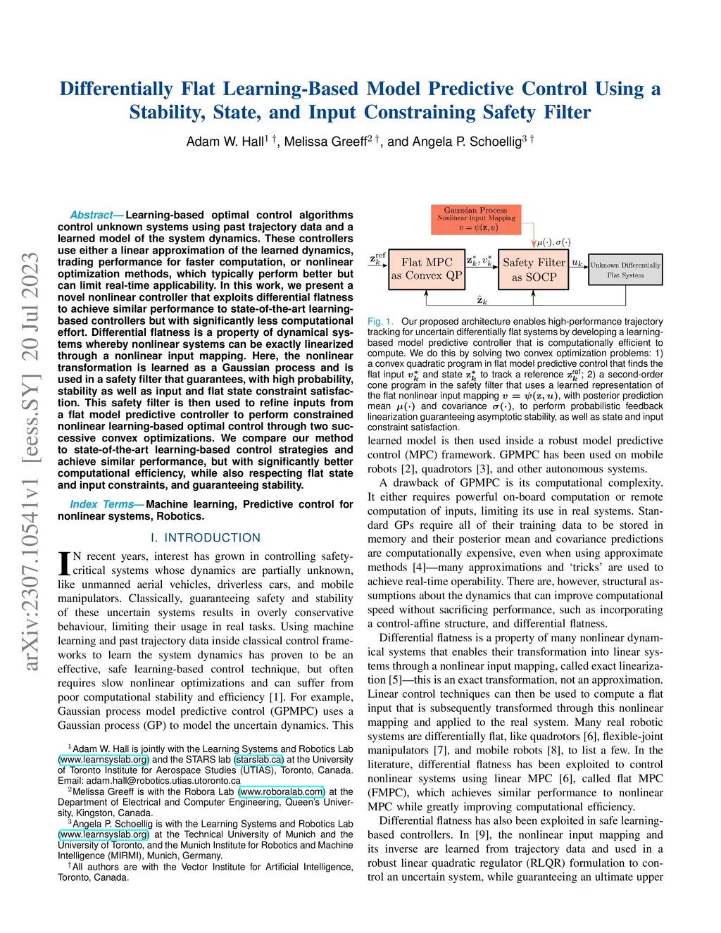 Learning-based optimal control algorithms control unknown systems using past trajectory data and a learned model of the system dynamics. These controllers use either a linear approximation of the learned dynamics, trading performance for faster computation, or nonlinear optimization methods, which typically perform better but can limit real-time applicability. In this work, we present a novel nonlinear controller that exploits differential flatness to achieve similar performance to state-of-the-art learning-based controllers but with significantly less computational effort. Differential flatness is a property of dynamical systems whereby nonlinear systems can be exactly linearized through a nonlinear input mapping. Here, the nonlinear transformation is learned as a Gaussian process and is used in a safety filter that guarantees, with high probability, stability as well as input and flat state constraint satisfaction. This safety filter is then used to refine inputs from a flat model predictive controller to perform constrained nonlinear learning-based optimal control through two successive convex optimizations. We compare our method to state-of-the-art learning-based control strategies and achieve similar performance, but with significantly better computational efficiency, while also respecting flat state and input constraints, and guaranteeing stability.