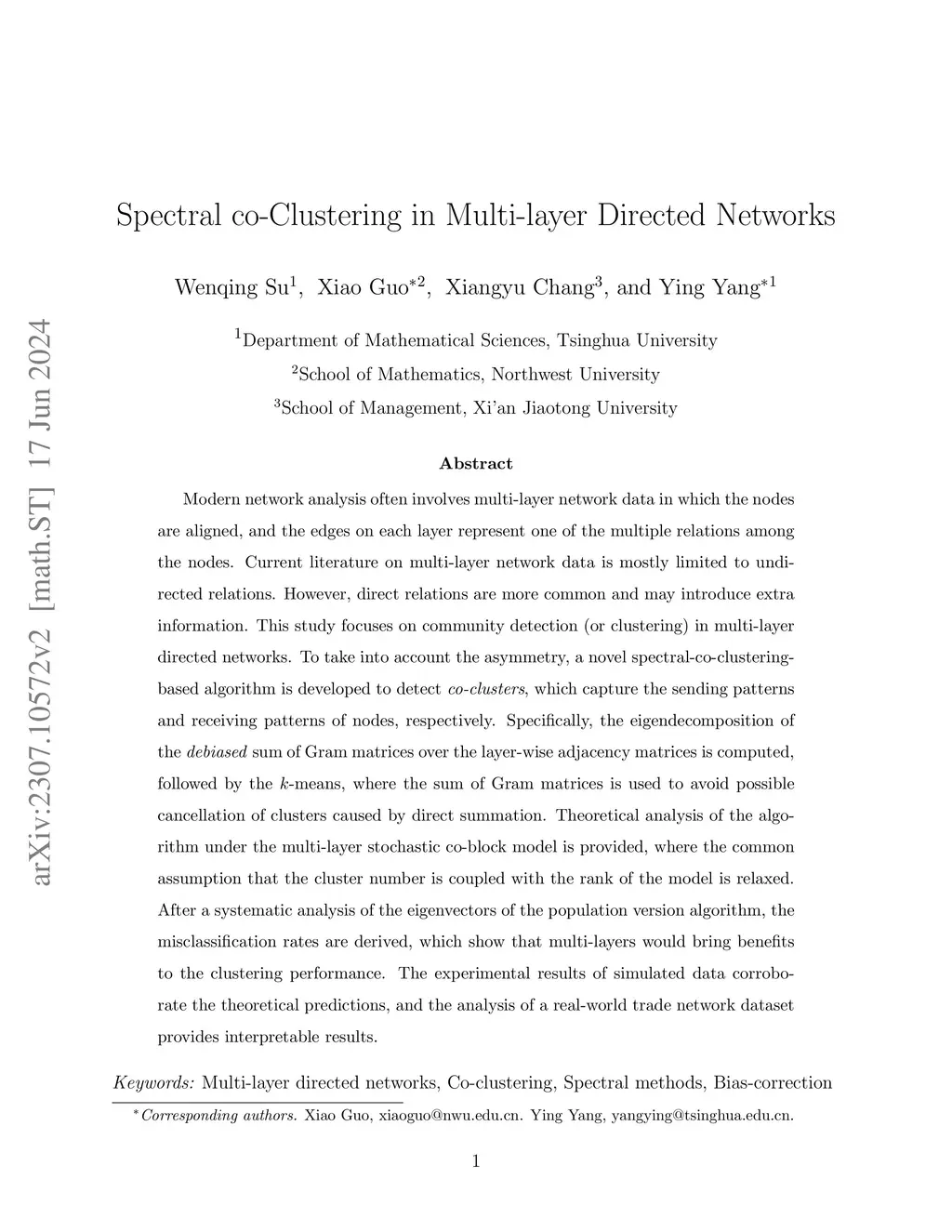 Modern network analysis often involves multi-layer network data in which the nodes are aligned, and the edges on each layer represent one of the multiple relations among the nodes. Current literature on multi-layer network data is mostly limited to undirected relations. However, direct relations are more common and may introduce extra information. This study focuses on community detection (or clustering) in multi-layer directed networks. To take into account the asymmetry, a novel spectral-co-clustering-based algorithm is developed to detect co-clusters, which capture the sending patterns and receiving patterns of nodes, respectively. Specifically, the eigendecomposition of the debiased sum of Gram matrices over the layer-wise adjacency matrices is computed, followed by the k-means, where the sum of Gram matrices is used to avoid possible cancellation of clusters caused by direct summation. Theoretical analysis of the algorithm under the multi-layer stochastic co-block model is provided, where the common assumption that the cluster number is coupled with the rank of the model is relaxed. After a systematic analysis of the eigenvectors of the population version algorithm, the misclassification rates are derived, which show that multi-layers would bring benefits to the clustering performance. The experimental results of simulated data corroborate the theoretical predictions, and the analysis of a real-world trade network dataset provides interpretable results.