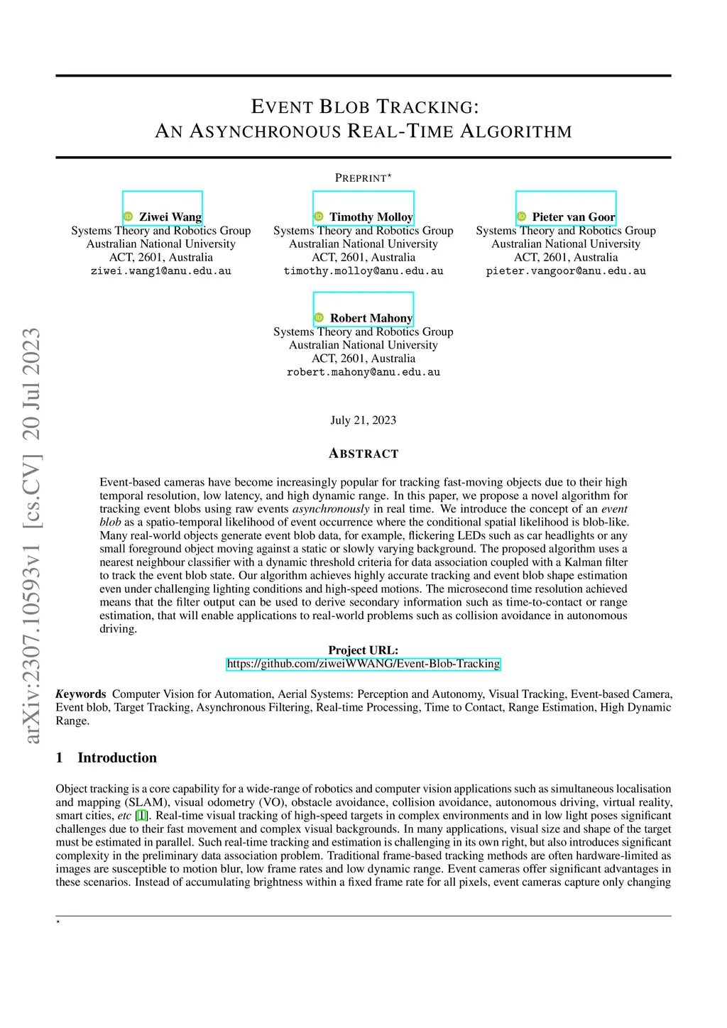 Event-based cameras have become increasingly popular for tracking fast-moving objects due to their high temporal resolution, low latency, and high dynamic range. In this paper, we propose a novel algorithm for tracking event blobs using raw events asynchronously in real time. We introduce the concept of an event blob as a spatio-temporal likelihood of event occurrence where the conditional spatial likelihood is blob-like. Many real-world objects generate event blob data, for example, flickering LEDs such as car headlights or any small foreground object moving against a static or slowly varying background. The proposed algorithm uses a nearest neighbour classifier with a dynamic threshold criteria for data association coupled with a Kalman filter to track the event blob state. Our algorithm achieves highly accurate tracking and event blob shape estimation even under challenging lighting conditions and high-speed motions. The microsecond time resolution achieved means that the filter output can be used to derive secondary information such as time-to-contact or range estimation, that will enable applications to real-world problems such as collision avoidance in autonomous driving.