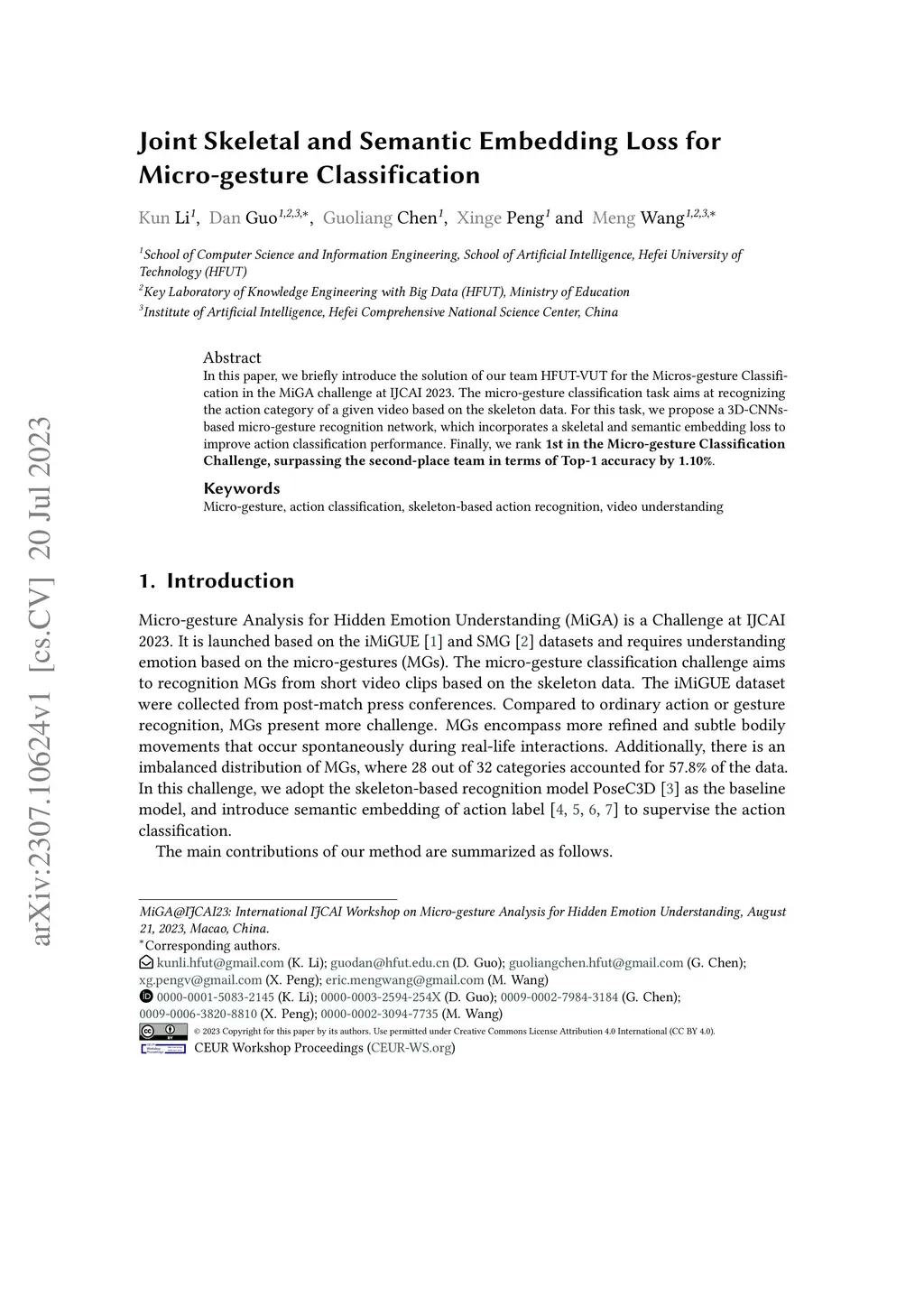 In this paper, we briefly introduce the solution of our team HFUT-VUT for the Micros-gesture Classification in the MiGA challenge at IJCAI 2023. The micro-gesture classification task aims at recognizing the action category of a given video based on the skeleton data. For this task, we propose a 3D-CNNs-based micro-gesture recognition network, which incorporates a skeletal and semantic embedding loss to improve action classification performance. Finally, we rank 1st in the Micro-gesture Classification Challenge, surpassing the second-place team in terms of Top-1 accuracy by 1.10%.