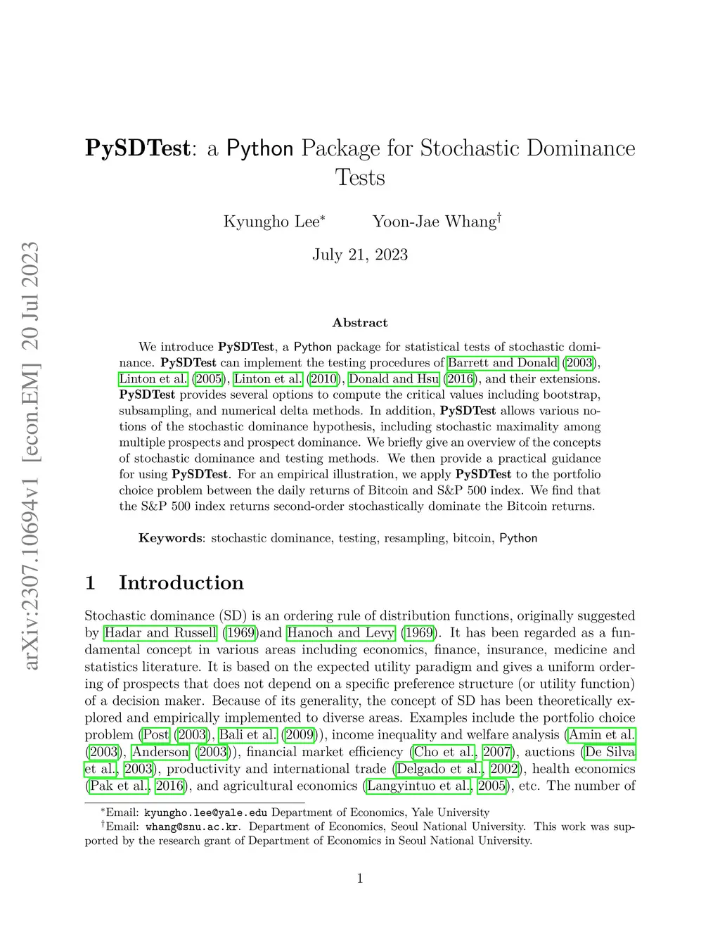We introduce PySDTest, a Python package for statistical tests of stochastic dominance. PySDTest can implement the testing procedures of Barrett and Donald (2003), Linton et al. (2005), Linton et al. (2010), Donald and Hsu (2016), and their extensions. PySDTest provides several options to compute the critical values including bootstrap, subsampling, and numerical delta methods. In addition, PySDTest allows various notions of the stochastic dominance hypothesis, including stochastic maximality among multiple prospects and prospect dominance. We briefly give an overview of the concepts of stochastic dominance and testing methods. We then provide a practical guidance for using PySDTest. For an empirical illustration, we apply PySDTest to the portfolio choice problem between the daily returns of Bitcoin and S&P 500 index. We find that the S&P 500 index returns second-order stochastically dominate the Bitcoin returns.