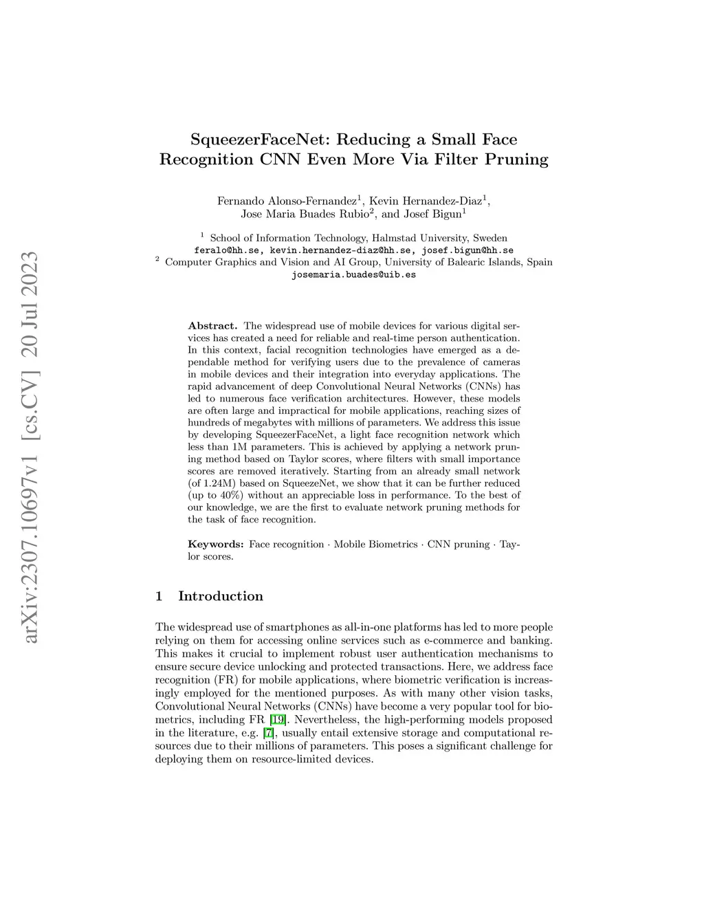 The widespread use of mobile devices for various digital services has created a need for reliable and real-time person authentication. In this context, facial recognition technologies have emerged as a dependable method for verifying users due to the prevalence of cameras in mobile devices and their integration into everyday applications. The rapid advancement of deep Convolutional Neural Networks (CNNs) has led to numerous face verification architectures. However, these models are often large and impractical for mobile applications, reaching sizes of hundreds of megabytes with millions of parameters. We address this issue by developing SqueezerFaceNet, a light face recognition network which less than 1M parameters. This is achieved by applying a network pruning method based on Taylor scores, where filters with small importance scores are removed iteratively. Starting from an already small network (of 1.24M) based on SqueezeNet, we show that it can be further reduced (up to 40%) without an appreciable loss in performance. To the best of our knowledge, we are the first to evaluate network pruning methods for the task of face recognition.