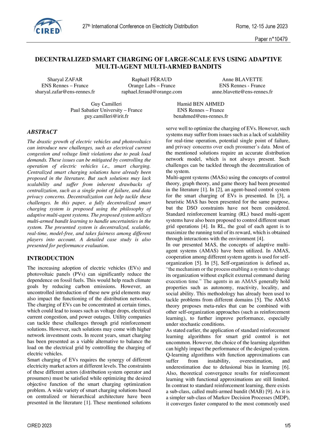 The drastic growth of electric vehicles and photovoltaics can introduce new challenges, such as electrical current congestion and voltage limit violations due to peak load demands. These issues can be mitigated by controlling the operation of electric vehicles i.e., smart charging. Centralized smart charging solutions have already been proposed in the literature. But such solutions may lack scalability and suffer from inherent drawbacks of centralization, such as a single point of failure, and data privacy concerns. Decentralization can help tackle these challenges. In this paper, a fully decentralized smart charging system is proposed using the philosophy of adaptive multi-agent systems. The proposed system utilizes multi-armed bandit learning to handle uncertainties in the system. The presented system is decentralized, scalable, real-time, model-free, and takes fairness among different players into account. A detailed case study is also presented for performance evaluation.