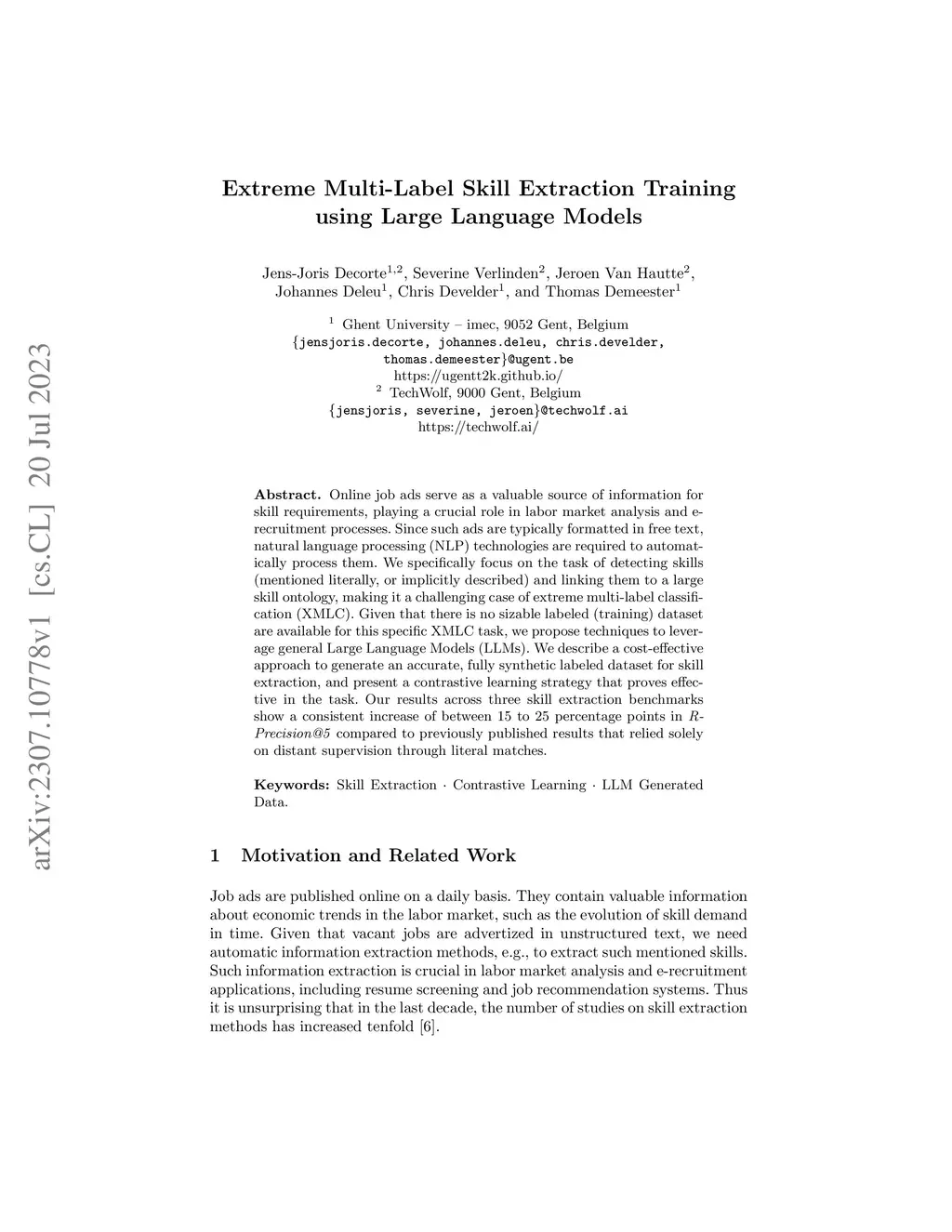 Online job ads serve as a valuable source of information for skill requirements, playing a crucial role in labor market analysis and e-recruitment processes. Since such ads are typically formatted in free text, natural language processing (NLP) technologies are required to automatically process them. We specifically focus on the task of detecting skills (mentioned literally, or implicitly described) and linking them to a large skill ontology, making it a challenging case of extreme multi-label classification (XMLC). Given that there is no sizable labeled (training) dataset are available for this specific XMLC task, we propose techniques to leverage general Large Language Models (LLMs). We describe a cost-effective approach to generate an accurate, fully synthetic labeled dataset for skill extraction, and present a contrastive learning strategy that proves effective in the task. Our results across three skill extraction benchmarks show a consistent increase of between 15 to 25 percentage points in \textit{R-Precision@5} compared to previously published results that relied solely on distant supervision through literal matches.