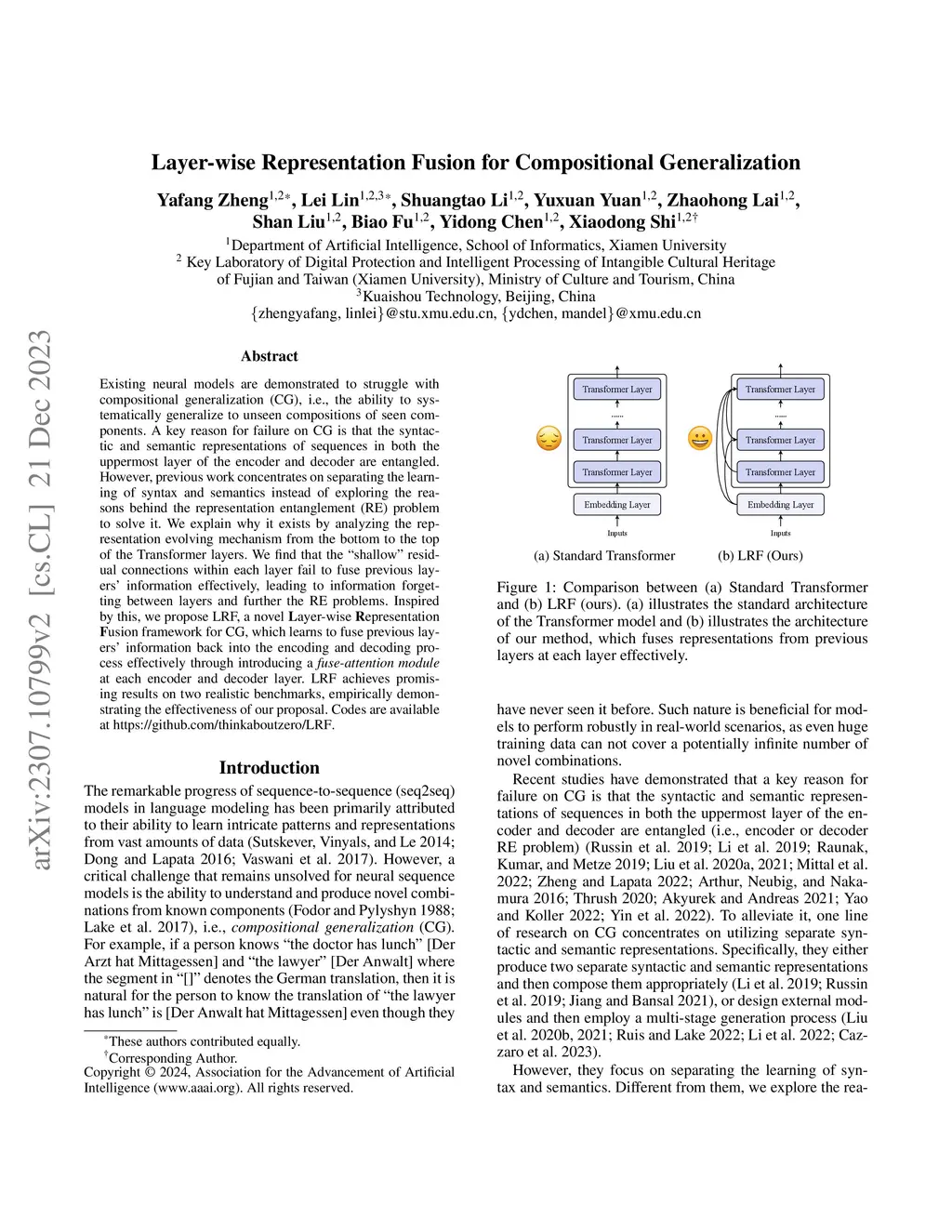 Existing neural models are demonstrated to struggle with compositional generalization (CG), i.e., the ability to systematically generalize to unseen compositions of seen components. A key reason for failure on CG is that the syntactic and semantic representations of sequences in both the uppermost layer of the encoder and decoder are entangled. However, previous work concentrates on separating the learning of syntax and semantics instead of exploring the reasons behind the representation entanglement (RE) problem to solve it. We explain why it exists by analyzing the representation evolving mechanism from the bottom to the top of the Transformer layers. We find that the ``shallow'' residual connections within each layer fail to fuse previous layers' information effectively, leading to information forgetting between layers and further the RE problems. Inspired by this, we propose LRF, a novel \textbf{L}ayer-wise \textbf{R}epresentation \textbf{F}usion framework for CG, which learns to fuse previous layers' information back into the encoding and decoding process effectively through introducing a \emph{fuse-attention module} at each encoder and decoder layer. LRF achieves promising results on two realistic benchmarks, empirically demonstrating the effectiveness of our proposal.