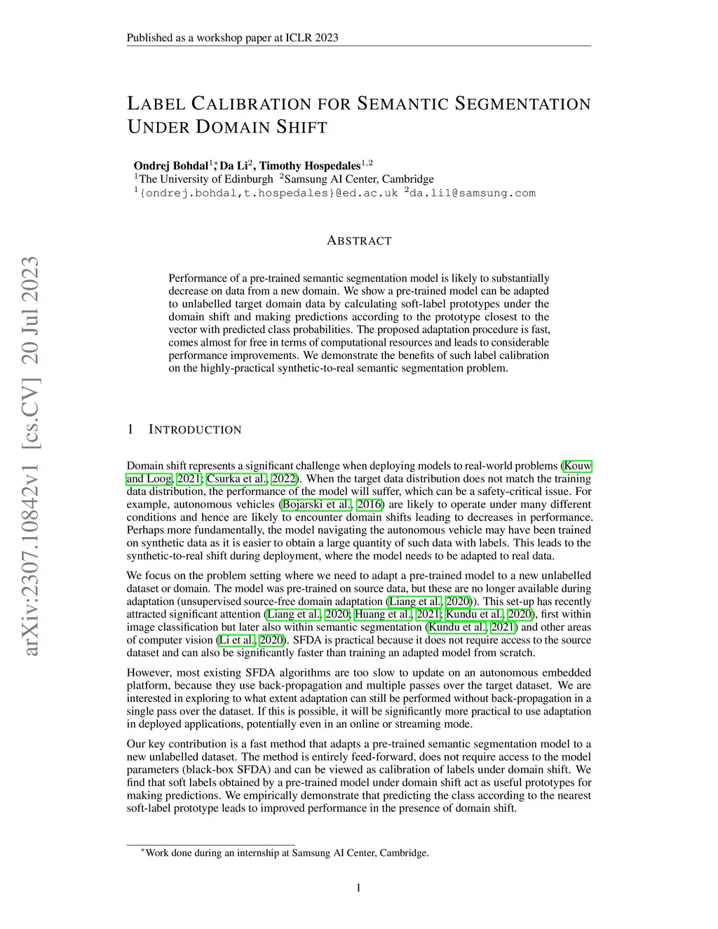 Performance of a pre-trained semantic segmentation model is likely to substantially decrease on data from a new domain. We show a pre-trained model can be adapted to unlabelled target domain data by calculating soft-label prototypes under the domain shift and making predictions according to the prototype closest to the vector with predicted class probabilities. The proposed adaptation procedure is fast, comes almost for free in terms of computational resources and leads to considerable performance improvements. We demonstrate the benefits of such label calibration on the highly-practical synthetic-to-real semantic segmentation problem.
