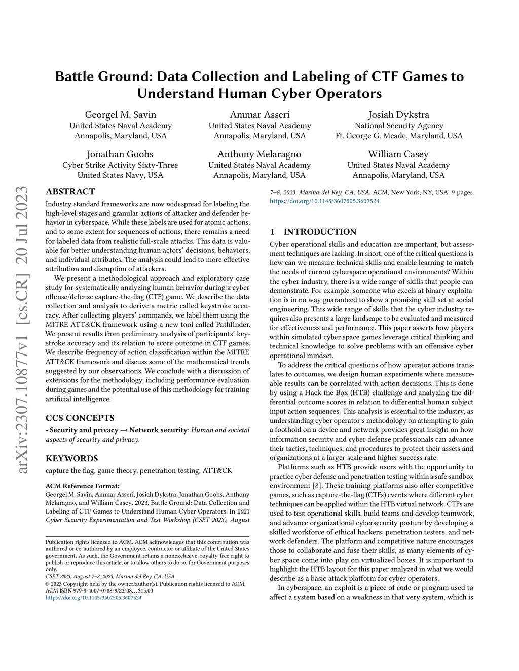 Industry standard frameworks are now widespread for labeling the high-level stages and granular actions of attacker and defender behavior in cyberspace. While these labels are used for atomic actions, and to some extent for sequences of actions, there remains a need for labeled data from realistic full-scale attacks. This data is valuable for better understanding human actors' decisions, behaviors, and individual attributes. The analysis could lead to more effective attribution and disruption of attackers. We present a methodological approach and exploratory case study for systematically analyzing human behavior during a cyber offense/defense capture-the-flag (CTF) game. We describe the data collection and analysis to derive a metric called keystroke accuracy. After collecting players' commands, we label them using the MITRE ATT&CK framework using a new tool called Pathfinder. We present results from preliminary analysis of participants' keystroke accuracy and its relation to score outcome in CTF games. We describe frequency of action classification within the MITRE ATT&CK framework and discuss some of the mathematical trends suggested by our observations. We conclude with a discussion of extensions for the methodology, including performance evaluation during games and the potential use of this methodology for training artificial intelligence.