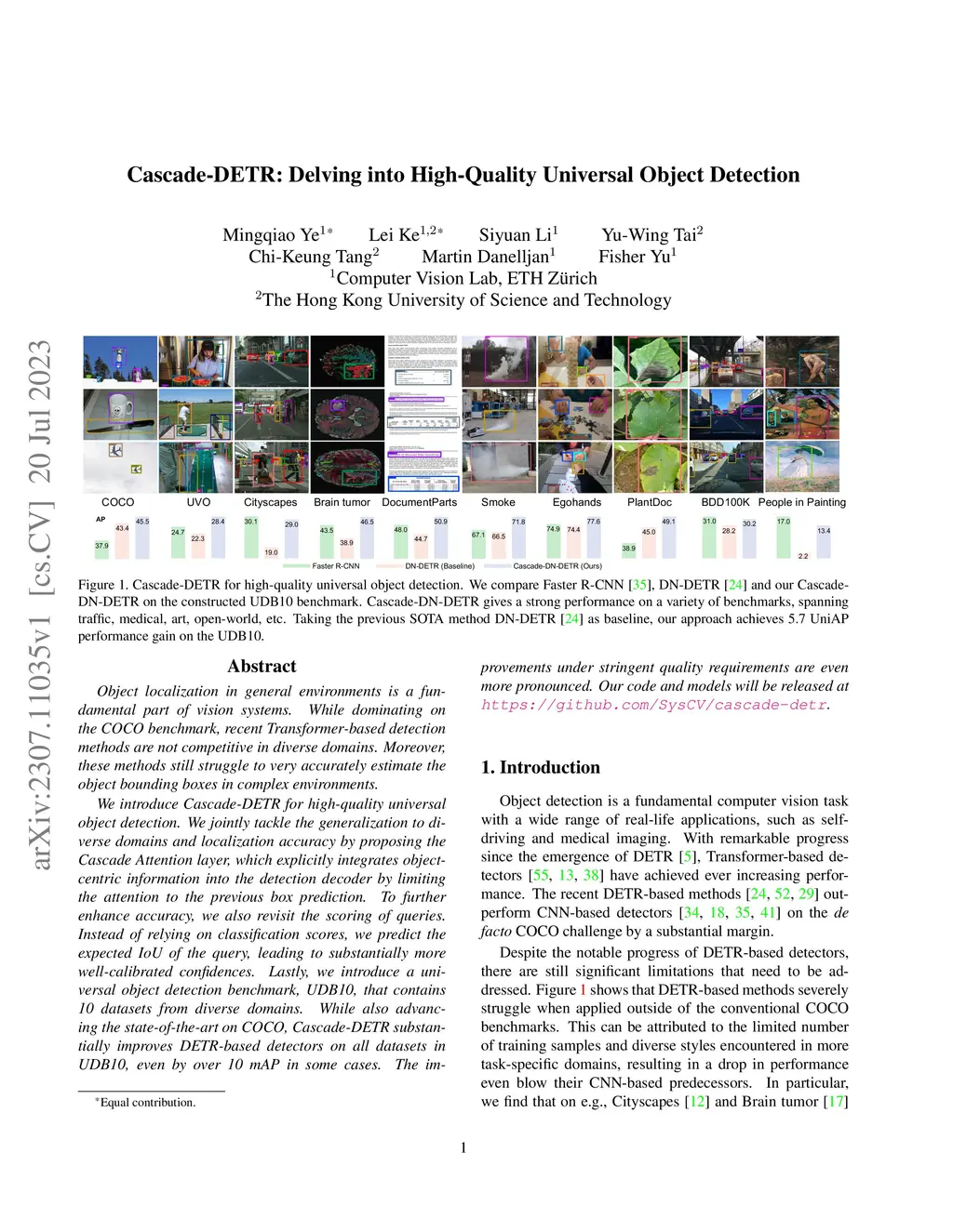 Object localization in general environments is a fundamental part of vision systems. While dominating on the COCO benchmark, recent Transformer-based detection methods are not competitive in diverse domains. Moreover, these methods still struggle to very accurately estimate the object bounding boxes in complex environments. We introduce Cascade-DETR for high-quality universal object detection. We jointly tackle the generalization to diverse domains and localization accuracy by proposing the Cascade Attention layer, which explicitly integrates object-centric information into the detection decoder by limiting the attention to the previous box prediction. To further enhance accuracy, we also revisit the scoring of queries. Instead of relying on classification scores, we predict the expected IoU of the query, leading to substantially more well-calibrated confidences. Lastly, we introduce a universal object detection benchmark, UDB10, that contains 10 datasets from diverse domains. While also advancing the state-of-the-art on COCO, Cascade-DETR substantially improves DETR-based detectors on all datasets in UDB10, even by over 10 mAP in some cases. The improvements under stringent quality requirements are even more pronounced. Our code and models will be released at https://github.com/SysCV/cascade-detr.