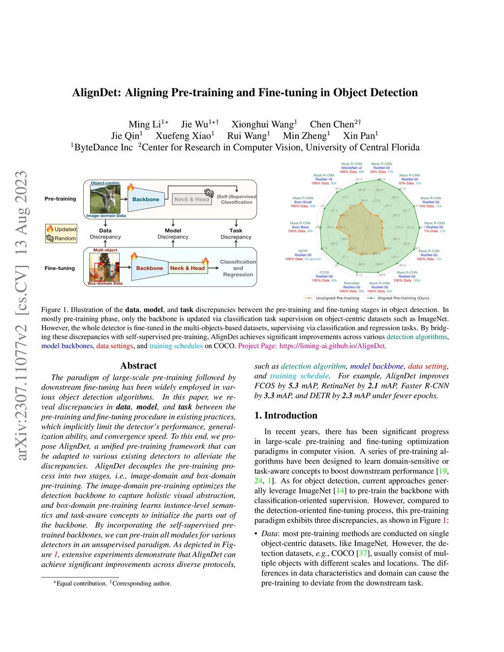 The paradigm of large-scale pre-training followed by downstream fine-tuning has been widely employed in various object detection algorithms. In this paper, we reveal discrepancies in data, model, and task between the pre-training and fine-tuning procedure in existing practices, which implicitly limit the detector's performance, generalization ability, and convergence speed. To this end, we propose AlignDet, a unified pre-training framework that can be adapted to various existing detectors to alleviate the discrepancies. AlignDet decouples the pre-training process into two stages, i.e., image-domain and box-domain pre-training. The image-domain pre-training optimizes the detection backbone to capture holistic visual abstraction, and box-domain pre-training learns instance-level semantics and task-aware concepts to initialize the parts out of the backbone. By incorporating the self-supervised pre-trained backbones, we can pre-train all modules for various detectors in an unsupervised paradigm. As depicted in Figure 1, extensive experiments demonstrate that AlignDet can achieve significant improvements across diverse protocols, such as detection algorithm, model backbone, data setting, and training schedule. For example, AlignDet improves FCOS by 5.3 mAP, RetinaNet by 2.1 mAP, Faster R-CNN by 3.3 mAP, and DETR by 2.3 mAP under fewer epochs.