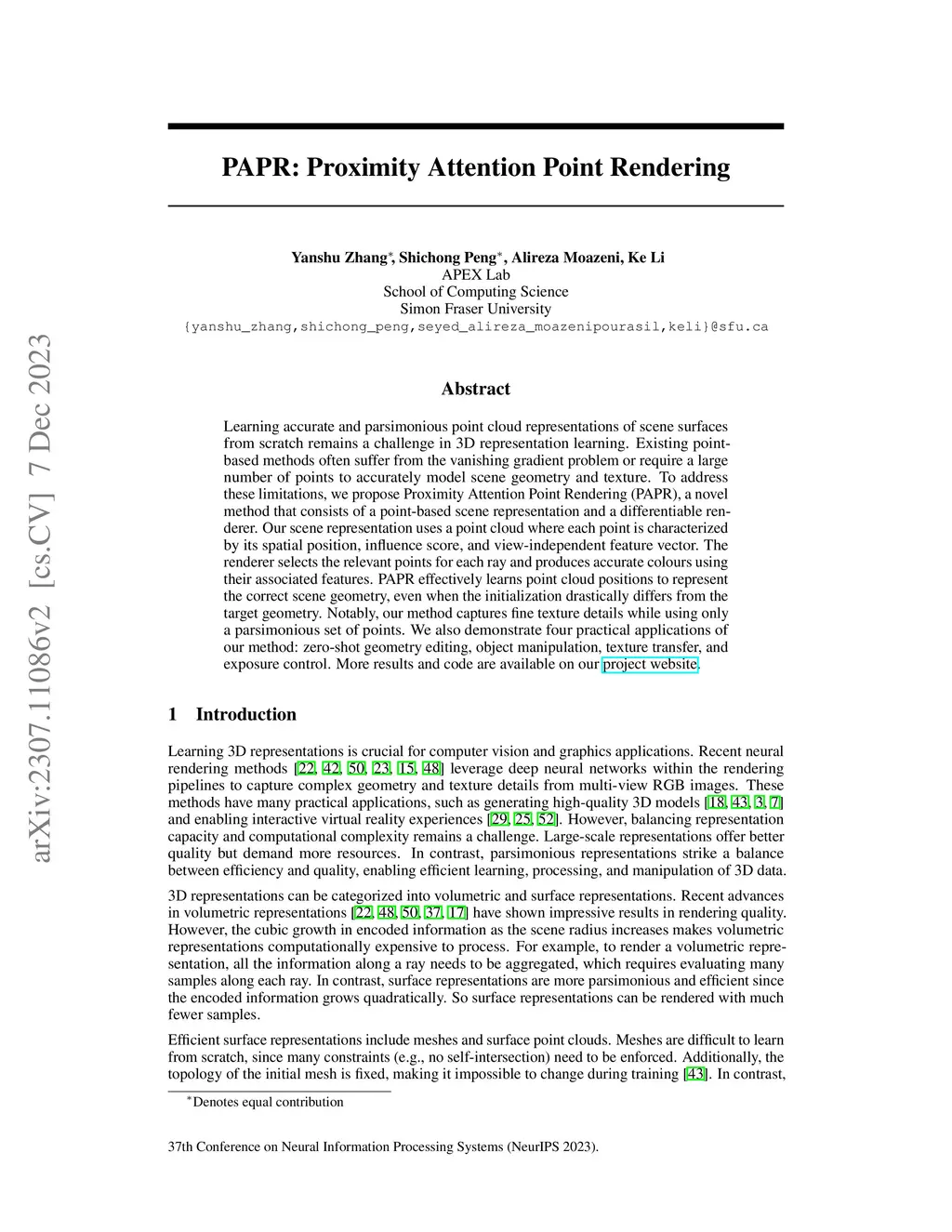 Learning accurate and parsimonious point cloud representations of scene surfaces from scratch remains a challenge in 3D representation learning. Existing point-based methods often suffer from the vanishing gradient problem or require a large number of points to accurately model scene geometry and texture. To address these limitations, we propose Proximity Attention Point Rendering (PAPR), a novel method that consists of a point-based scene representation and a differentiable renderer. Our scene representation uses a point cloud where each point is characterized by its spatial position, influence score, and view-independent feature vector. The renderer selects the relevant points for each ray and produces accurate colours using their associated features. PAPR effectively learns point cloud positions to represent the correct scene geometry, even when the initialization drastically differs from the target geometry. Notably, our method captures fine texture details while using only a parsimonious set of points. We also demonstrate four practical applications of our method: zero-shot geometry editing, object manipulation, texture transfer, and exposure control. More results and code are available on our project website at https://zvict.github.io/papr/.