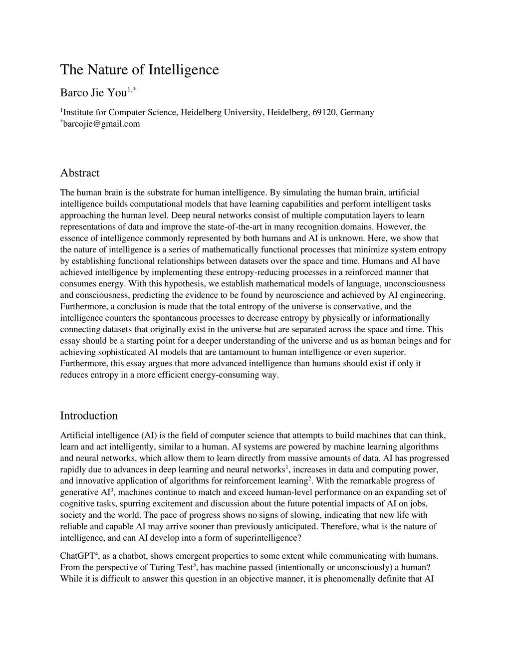 The human brain is the substrate for human intelligence. By simulating the human brain, artificial intelligence builds computational models that have learning capabilities and perform intelligent tasks approaching the human level. Deep neural networks consist of multiple computation layers to learn representations of data and improve the state-of-the-art in many recognition domains. However, the essence of intelligence commonly represented by both humans and AI is unknown. Here, we show that the nature of intelligence is a series of mathematically functional processes that minimize system entropy by establishing functional relationships between datasets over the space and time. Humans and AI have achieved intelligence by implementing these entropy-reducing processes in a reinforced manner that consumes energy. With this hypothesis, we establish mathematical models of language, unconsciousness and consciousness, predicting the evidence to be found by neuroscience and achieved by AI engineering. Furthermore, a conclusion is made that the total entropy of the universe is conservative, and the intelligence counters the spontaneous processes to decrease entropy by physically or informationally connecting datasets that originally exist in the universe but are separated across the space and time. This essay should be a starting point for a deeper understanding of the universe and us as human beings and for achieving sophisticated AI models that are tantamount to human intelligence or even superior. Furthermore, this essay argues that more advanced intelligence than humans should exist if only it reduces entropy in a more efficient energy-consuming way.