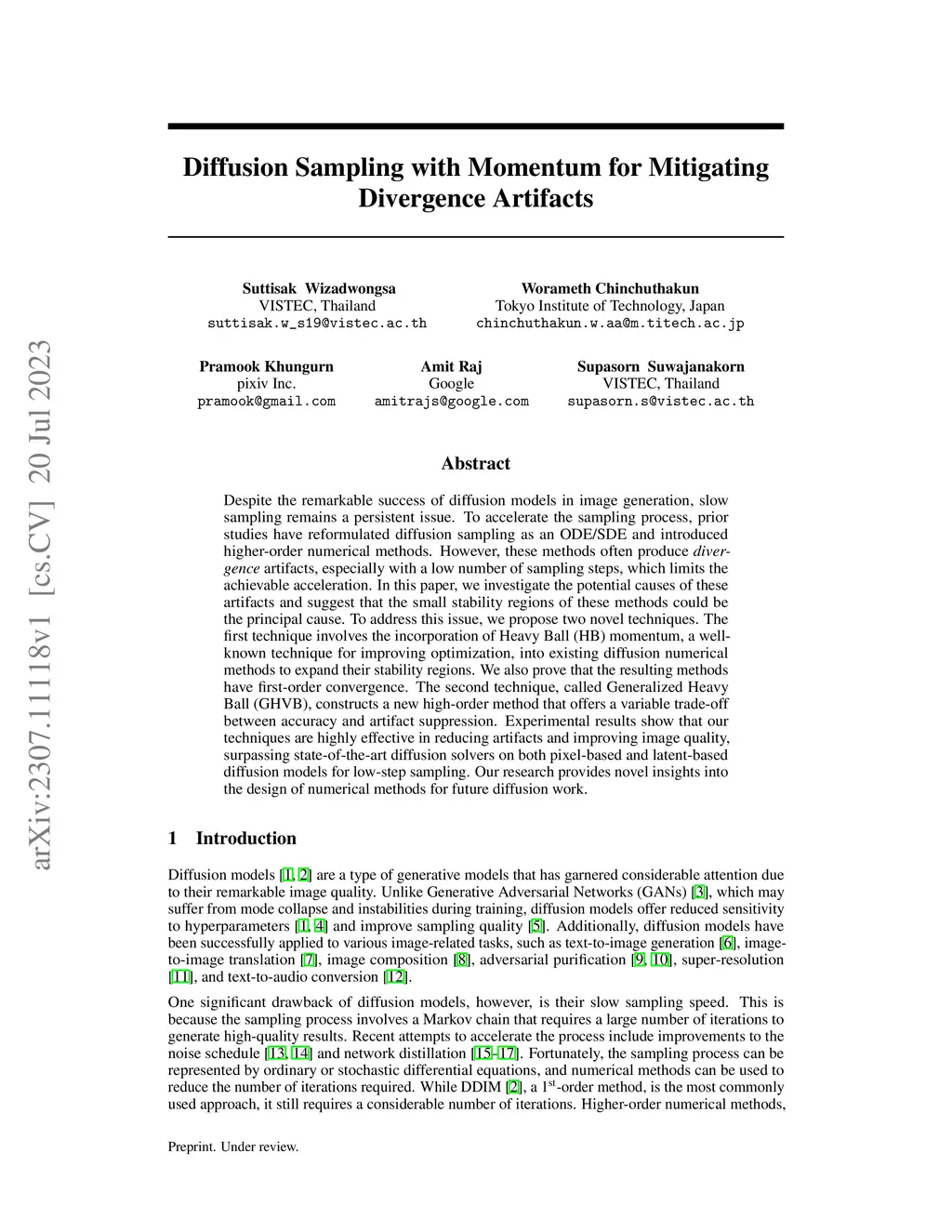 Despite the remarkable success of diffusion models in image generation, slow sampling remains a persistent issue. To accelerate the sampling process, prior studies have reformulated diffusion sampling as an ODE/SDE and introduced higher-order numerical methods. However, these methods often produce divergence artifacts, especially with a low number of sampling steps, which limits the achievable acceleration. In this paper, we investigate the potential causes of these artifacts and suggest that the small stability regions of these methods could be the principal cause. To address this issue, we propose two novel techniques. The first technique involves the incorporation of Heavy Ball (HB) momentum, a well-known technique for improving optimization, into existing diffusion numerical methods to expand their stability regions. We also prove that the resulting methods have first-order convergence. The second technique, called Generalized Heavy Ball (GHVB), constructs a new high-order method that offers a variable trade-off between accuracy and artifact suppression. Experimental results show that our techniques are highly effective in reducing artifacts and improving image quality, surpassing state-of-the-art diffusion solvers on both pixel-based and latent-based diffusion models for low-step sampling. Our research provides novel insights into the design of numerical methods for future diffusion work.