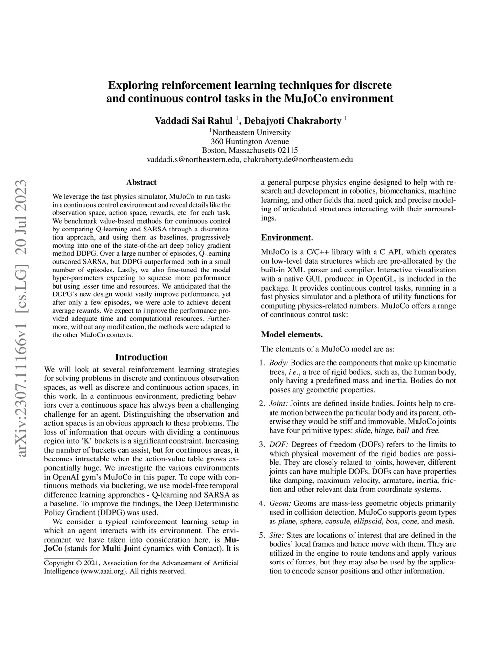 We leverage the fast physics simulator, MuJoCo to run tasks in a continuous control environment and reveal details like the observation space, action space, rewards, etc. for each task. We benchmark value-based methods for continuous control by comparing Q-learning and SARSA through a discretization approach, and using them as baselines, progressively moving into one of the state-of-the-art deep policy gradient method DDPG. Over a large number of episodes, Qlearning outscored SARSA, but DDPG outperformed both in a small number of episodes. Lastly, we also fine-tuned the model hyper-parameters expecting to squeeze more performance but using lesser time and resources. We anticipated that the new design for DDPG would vastly improve performance, yet after only a few episodes, we were able to achieve decent average rewards. We expect to improve the performance provided adequate time and computational resources.