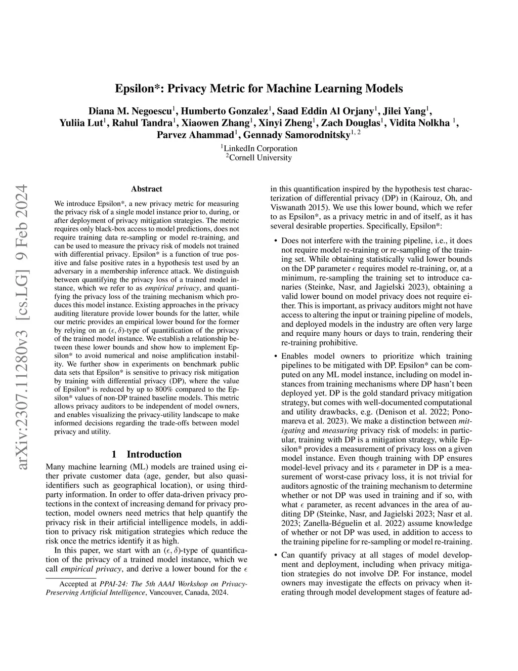 We introduce Epsilon*, a new privacy metric for measuring the privacy risk of a single model instance prior to, during, or after deployment of privacy mitigation strategies. The metric requires only black-box access to model predictions, does not require training data re-sampling or model re-training, and can be used to measure the privacy risk of models not trained with differential privacy. Epsilon* is a function of true positive and false positive rates in a hypothesis test used by an adversary in a membership inference attack. We distinguish between quantifying the privacy loss of a trained model instance, which we refer to as empirical privacy, and quantifying the privacy loss of the training mechanism which produces this model instance. Existing approaches in the privacy auditing literature provide lower bounds for the latter, while our metric provides an empirical lower bound for the former by relying on an (, )-type of quantification of the privacy of the trained model instance. We establish a relationship between these lower bounds and show how to implement Epsilon* to avoid numerical and noise amplification instability. We further show in experiments on benchmark public data sets that Epsilon* is sensitive to privacy risk mitigation by training with differential privacy (DP), where the value of Epsilon* is reduced by up to 800% compared to the Epsilon* values of non-DP trained baseline models. This metric allows privacy auditors to be independent of model owners, and enables visualizing the privacy-utility landscape to make informed decisions regarding the trade-offs between model privacy and utility.