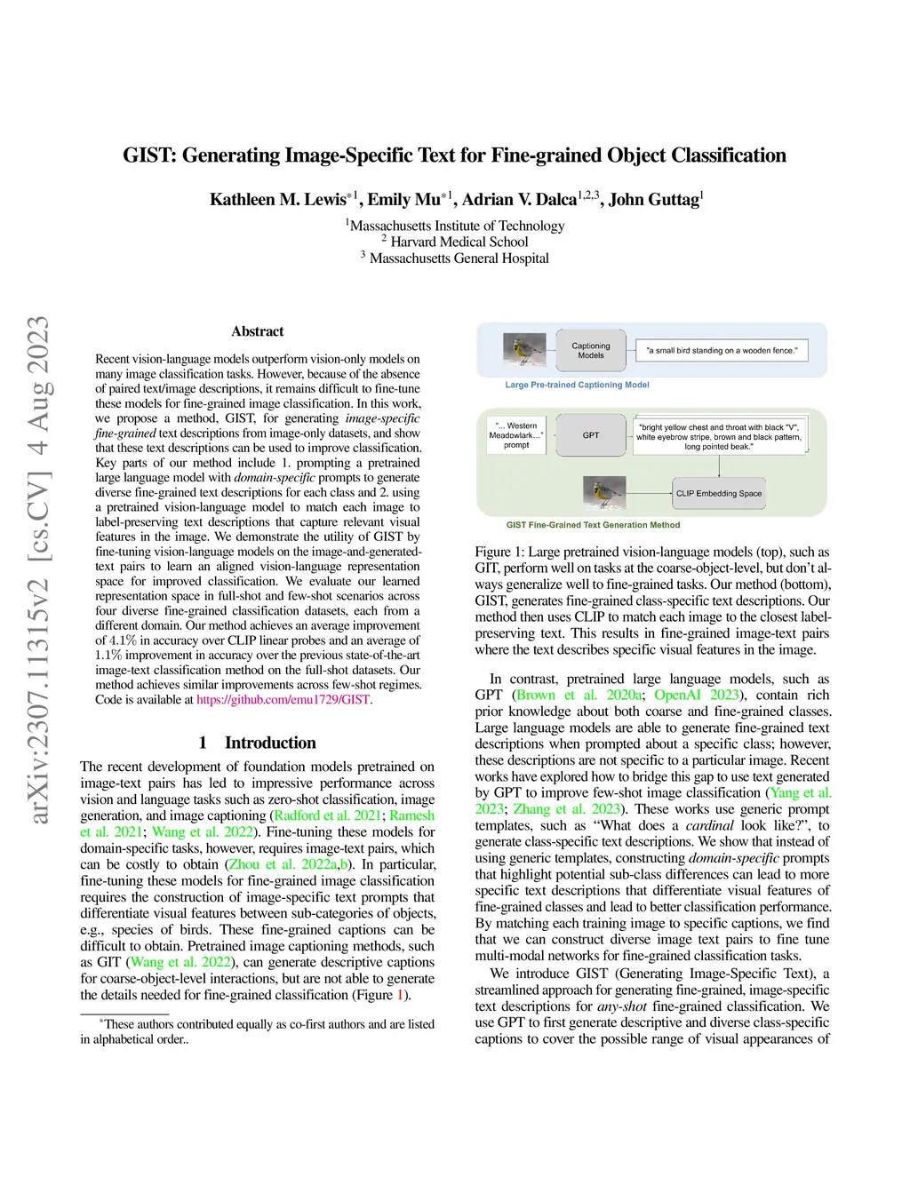 Recent vision-language models outperform vision-only models on many image classification tasks. However, because of the absence of paired text/image descriptions, it remains difficult to fine-tune these models for fine-grained image classification. In this work, we propose a method, GIST, for generating image-specific fine-grained text descriptions from image-only datasets, and show that these text descriptions can be used to improve classification. Key parts of our method include 1. prompting a pretrained large language model with domain-specific prompts to generate diverse fine-grained text descriptions for each class and 2. using a pretrained vision-language model to match each image to label-preserving text descriptions that capture relevant visual features in the image. We demonstrate the utility of GIST by fine-tuning vision-language models on the image-and-generated-text pairs to learn an aligned vision-language representation space for improved classification. We evaluate our learned representation space in full-shot and few-shot scenarios across four diverse fine-grained classification datasets, each from a different domain. Our method achieves an average improvement of in accuracy over CLIP linear probes and an average of improvement in accuracy over the previous state-of-the-art image-text classification method on the full-shot datasets. Our method achieves similar improvements across few-shot regimes. Code is available at https://github.com/emu1729/GIST.