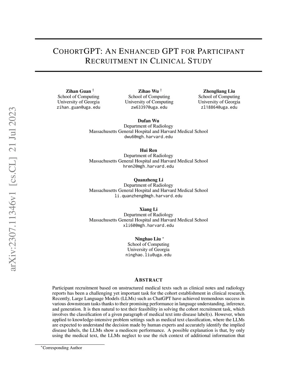 CohortGPT: An Enhanced GPT for Participant Recruitment in Clinical Study