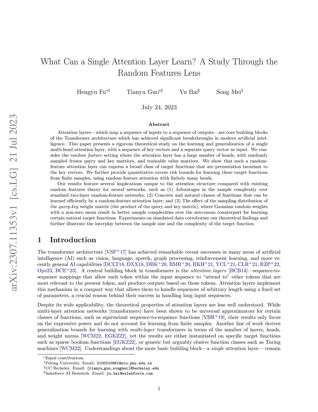 Attention layers -- which map a sequence of inputs to a sequence of outputs -- are core building blocks of the Transformer architecture which has achieved significant breakthroughs in modern artificial intelligence. This paper presents a rigorous theoretical study on the learning and generalization of a single multi-head attention layer, with a sequence of key vectors and a separate query vector as input. We consider the random feature setting where the attention layer has a large number of heads, with randomly sampled frozen query and key matrices, and trainable value matrices. We show that such a random-feature attention layer can express a broad class of target functions that are permutation invariant to the key vectors. We further provide quantitative excess risk bounds for learning these target functions from finite samples, using random feature attention with finitely many heads. Our results feature several implications unique to the attention structure compared with existing random features theory for neural networks, such as (1) Advantages in the sample complexity over standard two-layer random-feature networks; (2) Concrete and natural classes of functions that can be learned efficiently by a random-feature attention layer; and (3) The effect of the sampling distribution of the query-key weight matrix (the product of the query and key matrix), where Gaussian random weights with a non-zero mean result in better sample complexities over the zero-mean counterpart for learning certain natural target functions. Experiments on simulated data corroborate our theoretical findings and further illustrate the interplay between the sample size and the complexity of the target function.