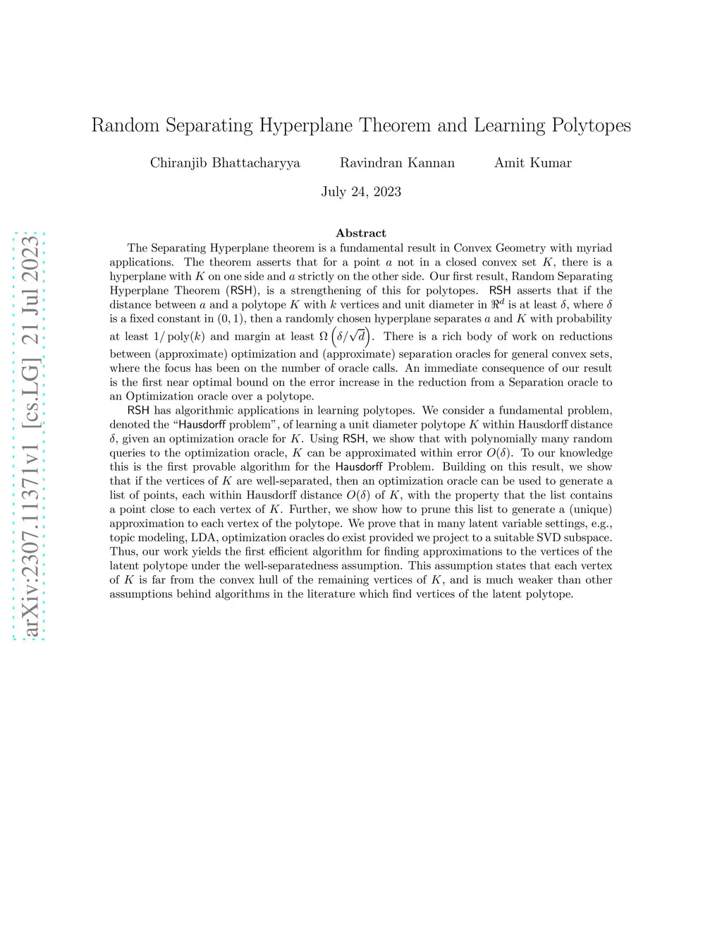 The Separating Hyperplane theorem is a fundamental result in Convex Geometry with myriad applications. Our first result, Random Separating Hyperplane Theorem (RSH), is a strengthening of this for polytopes. asserts that if the distance between and a polytope with vertices and unit diameter in is at least , where is a fixed constant in , then a randomly chosen hyperplane separates and with probability at least and margin at least . An immediate consequence of our result is the first near optimal bound on the error increase in the reduction from a Separation oracle to an Optimization oracle over a polytope. RSH has algorithmic applications in learning polytopes. We consider a fundamental problem, denoted the ``Hausdorff problem'', of learning a unit diameter polytope within Hausdorff distance , given an optimization oracle for . Using RSH, we show that with polynomially many random queries to the optimization oracle, can be approximated within error . To our knowledge this is the first provable algorithm for the Hausdorff Problem. Building on this result, we show that if the vertices of are well-separated, then an optimization oracle can be used to generate a list of points, each within Hausdorff distance of , with the property that the list contains a point close to each vertex of . Further, we show how to prune this list to generate a (unique) approximation to each vertex of the polytope. We prove that in many latent variable settings, e.g., topic modeling, LDA, optimization oracles do exist provided we project to a suitable SVD subspace. Thus, our work yields the first efficient algorithm for finding approximations to the vertices of the latent polytope under the well-separatedness assumption.