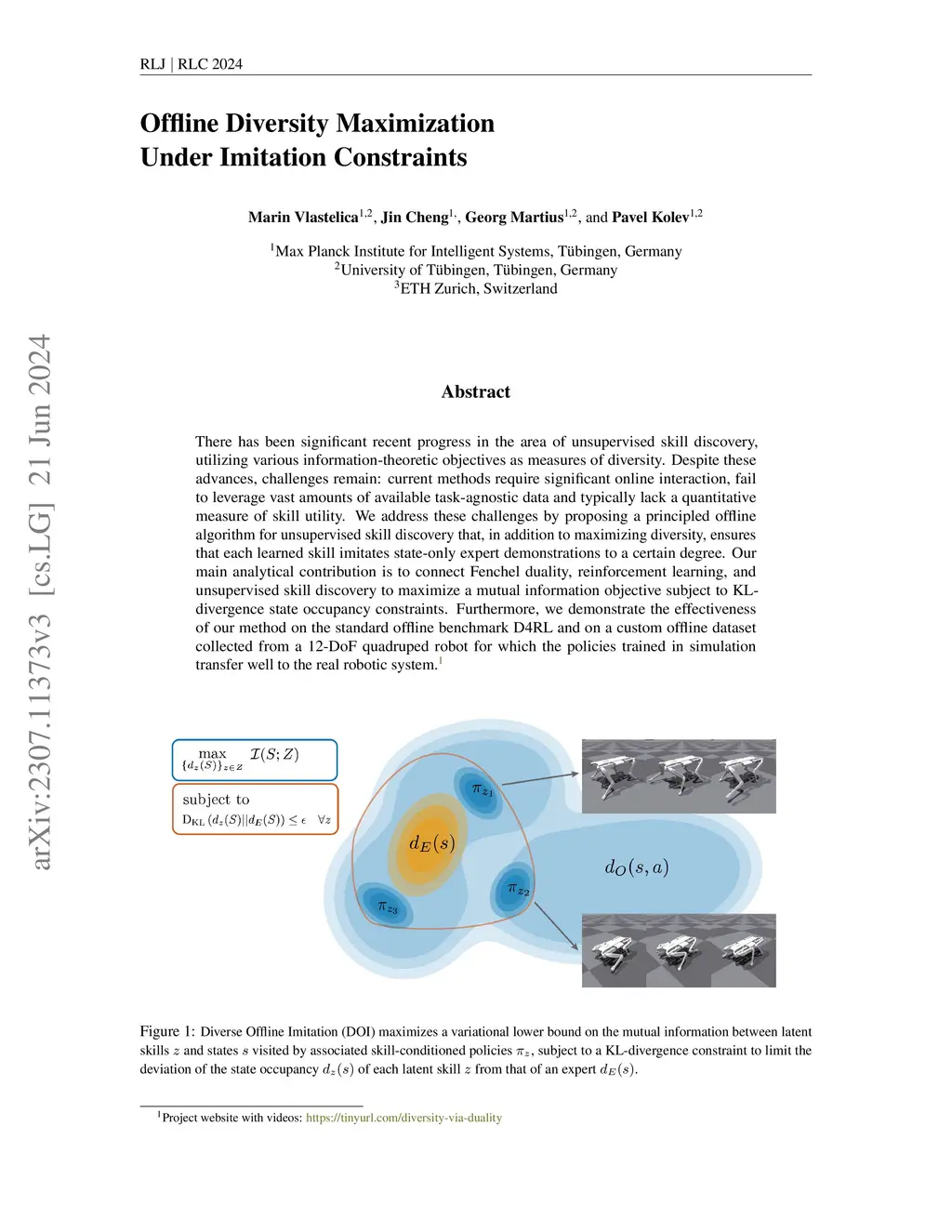 There has been significant recent progress in the area of unsupervised skill discovery, utilizing various information-theoretic objectives as measures of diversity. Despite these advances, challenges remain: current methods require significant online interaction, fail to leverage vast amounts of available task-agnostic data and typically lack a quantitative measure of skill utility. We address these challenges by proposing a principled offline algorithm for unsupervised skill discovery that, in addition to maximizing diversity, ensures that each learned skill imitates state-only expert demonstrations to a certain degree. Our main analytical contribution is to connect Fenchel duality, reinforcement learning, and unsupervised skill discovery to maximize a mutual information objective subject to KL-divergence state occupancy constraints. Furthermore, we demonstrate the effectiveness of our method on the standard offline benchmark D4RL and on a custom offline dataset collected from a 12-DoF quadruped robot for which the policies trained in simulation transfer well to the real robotic system.
