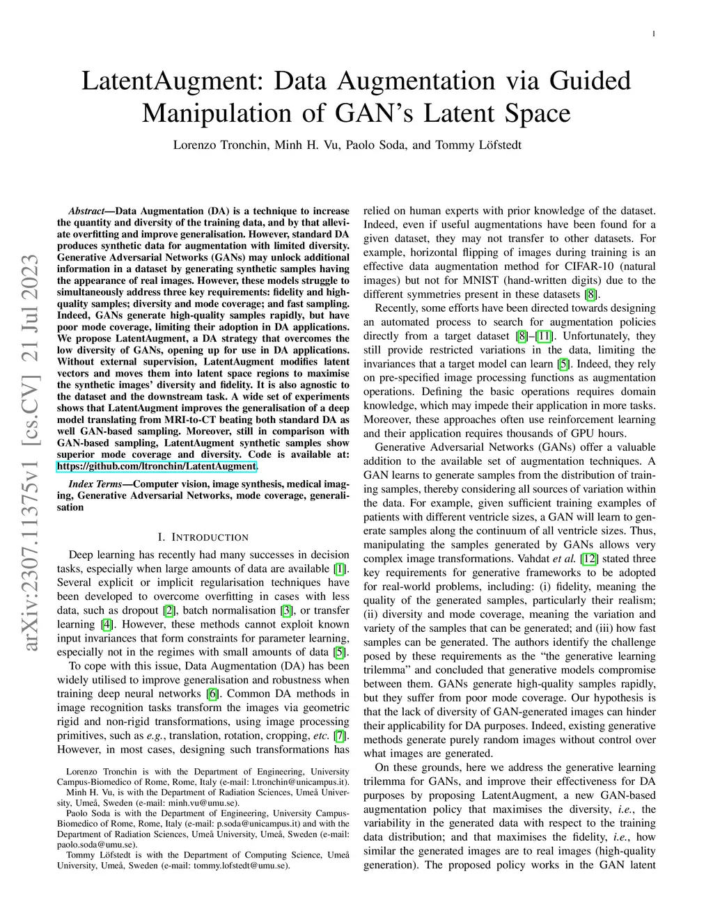 Data Augmentation (DA) is a technique to increase the quantity and diversity of the training data, and by that alleviate overfitting and improve generalisation. However, standard DA produces synthetic data for augmentation with limited diversity. Generative Adversarial Networks (GANs) may unlock additional information in a dataset by generating synthetic samples having the appearance of real images. However, these models struggle to simultaneously address three key requirements: fidelity and high-quality samples; diversity and mode coverage; and fast sampling. Indeed, GANs generate high-quality samples rapidly, but have poor mode coverage, limiting their adoption in DA applications. We propose LatentAugment, a DA strategy that overcomes the low diversity of GANs, opening up for use in DA applications. Without external supervision, LatentAugment modifies latent vectors and moves them into latent space regions to maximise the synthetic images' diversity and fidelity. It is also agnostic to the dataset and the downstream task. A wide set of experiments shows that LatentAugment improves the generalisation of a deep model translating from MRI-to-CT beating both standard DA as well GAN-based sampling. Moreover, still in comparison with GAN-based sampling, LatentAugment synthetic samples show superior mode coverage and diversity. Code is available at: https://github.com/ltronchin/LatentAugment.