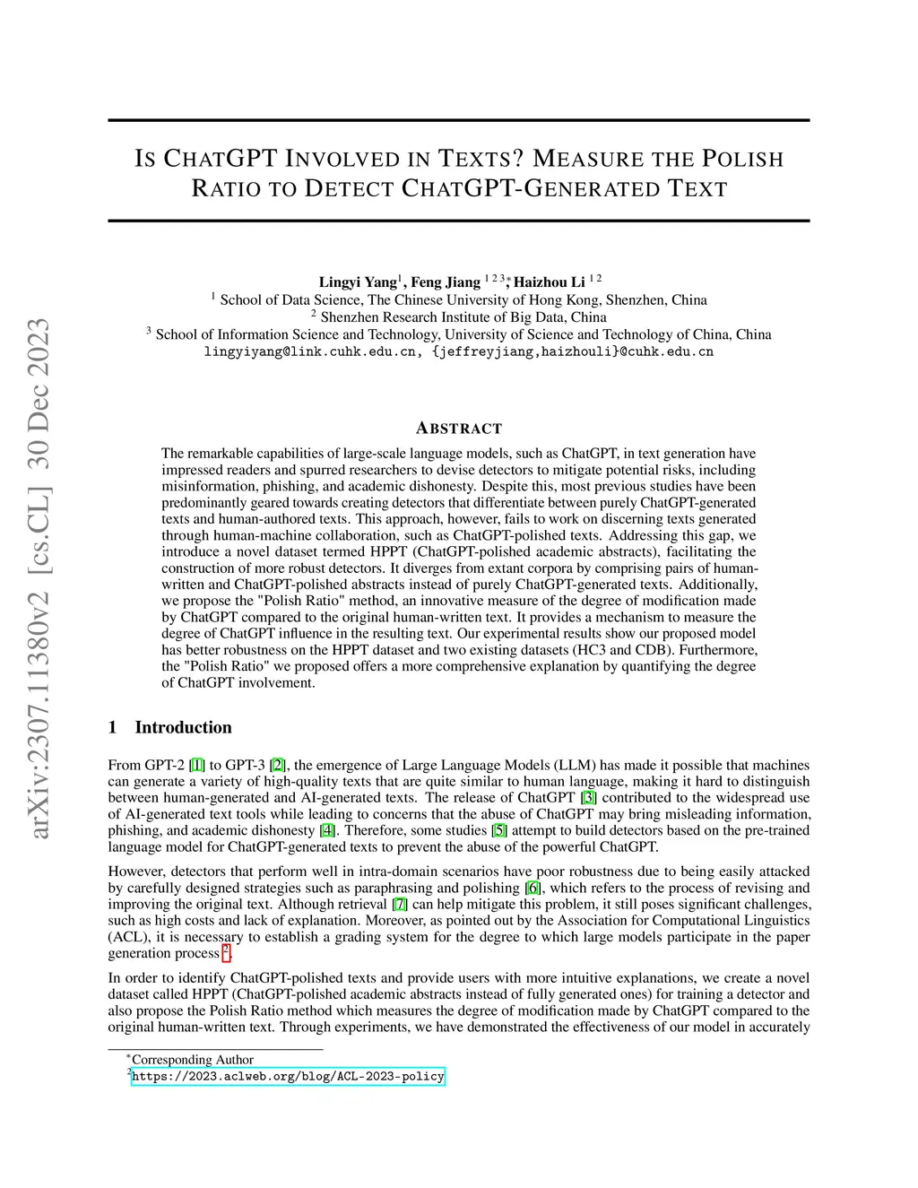 The remarkable capabilities of large-scale language models, such as ChatGPT, in text generation have impressed readers and spurred researchers to devise detectors to mitigate potential risks, including misinformation, phishing, and academic dishonesty. Despite this, most previous studies have been predominantly geared towards creating detectors that differentiate between purely ChatGPT-generated texts and human-authored texts. This approach, however, fails to work on discerning texts generated through human-machine collaboration, such as ChatGPT-polished texts. Addressing this gap, we introduce a novel dataset termed HPPT (ChatGPT-polished academic abstracts), facilitating the construction of more robust detectors. It diverges from extant corpora by comprising pairs of human-written and ChatGPT-polished abstracts instead of purely ChatGPT-generated texts. Additionally, we propose the "Polish Ratio" method, an innovative measure of the degree of modification made by ChatGPT compared to the original human-written text. It provides a mechanism to measure the degree of ChatGPT influence in the resulting text. Our experimental results show our proposed model has better robustness on the HPPT dataset and two existing datasets (HC3 and CDB). Furthermore, the "Polish Ratio" we proposed offers a more comprehensive explanation by quantifying the degree of ChatGPT involvement.