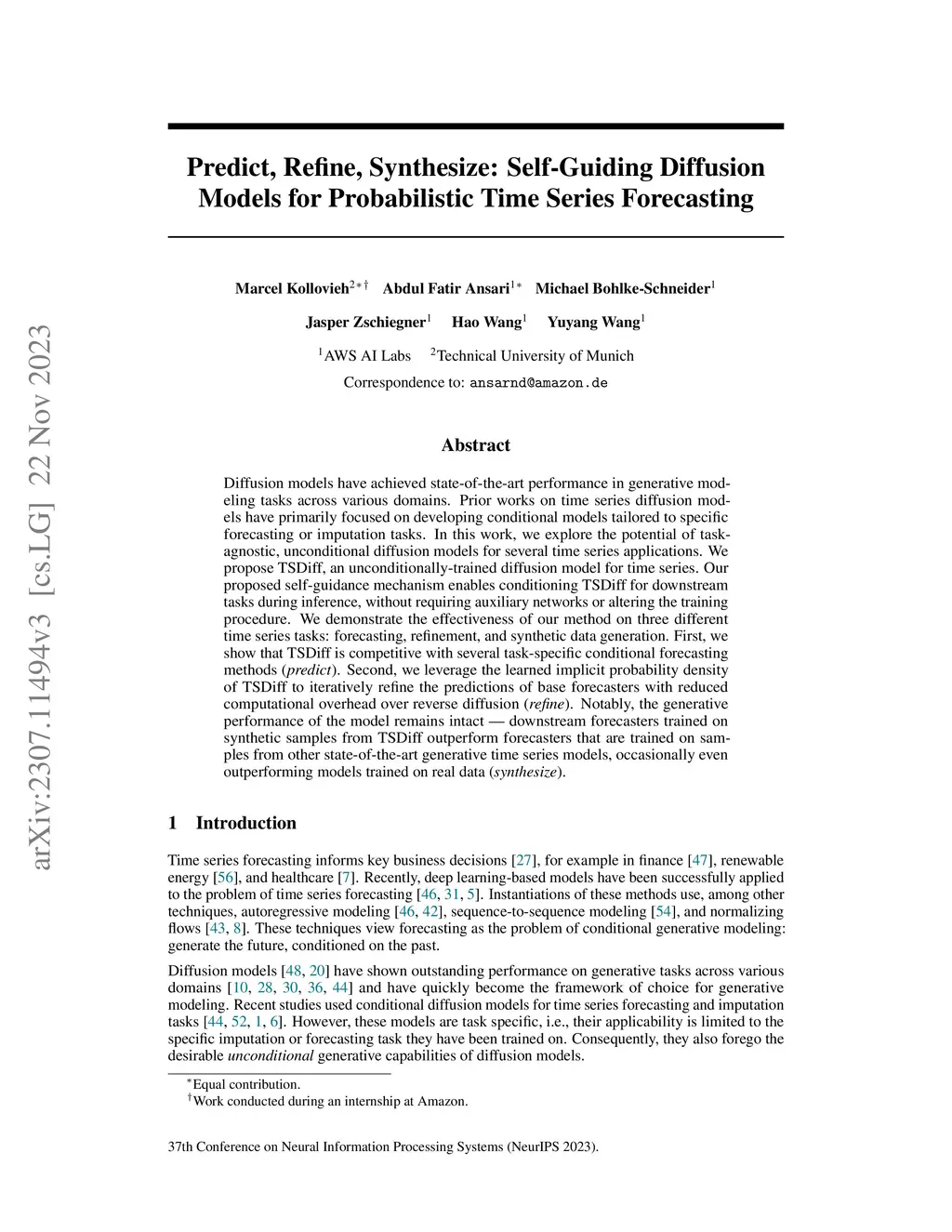 Diffusion models have achieved state-of-the-art performance in generative modeling tasks across various domains. Prior works on time series diffusion models have primarily focused on developing conditional models tailored to specific forecasting or imputation tasks. In this work, we explore the potential of task-agnostic, unconditional diffusion models for several time series applications. We propose TSDiff, an unconditionally-trained diffusion model for time series. Our proposed self-guidance mechanism enables conditioning TSDiff for downstream tasks during inference, without requiring auxiliary networks or altering the training procedure. We demonstrate the effectiveness of our method on three different time series tasks: forecasting, refinement, and synthetic data generation. First, we show that TSDiff is competitive with several task-specific conditional forecasting methods (predict). Second, we leverage the learned implicit probability density of TSDiff to iteratively refine the predictions of base forecasters with reduced computational overhead over reverse diffusion (refine). Notably, the generative performance of the model remains intact -- downstream forecasters trained on synthetic samples from TSDiff outperform forecasters that are trained on samples from other state-of-the-art generative time series models, occasionally even outperforming models trained on real data (synthesize).