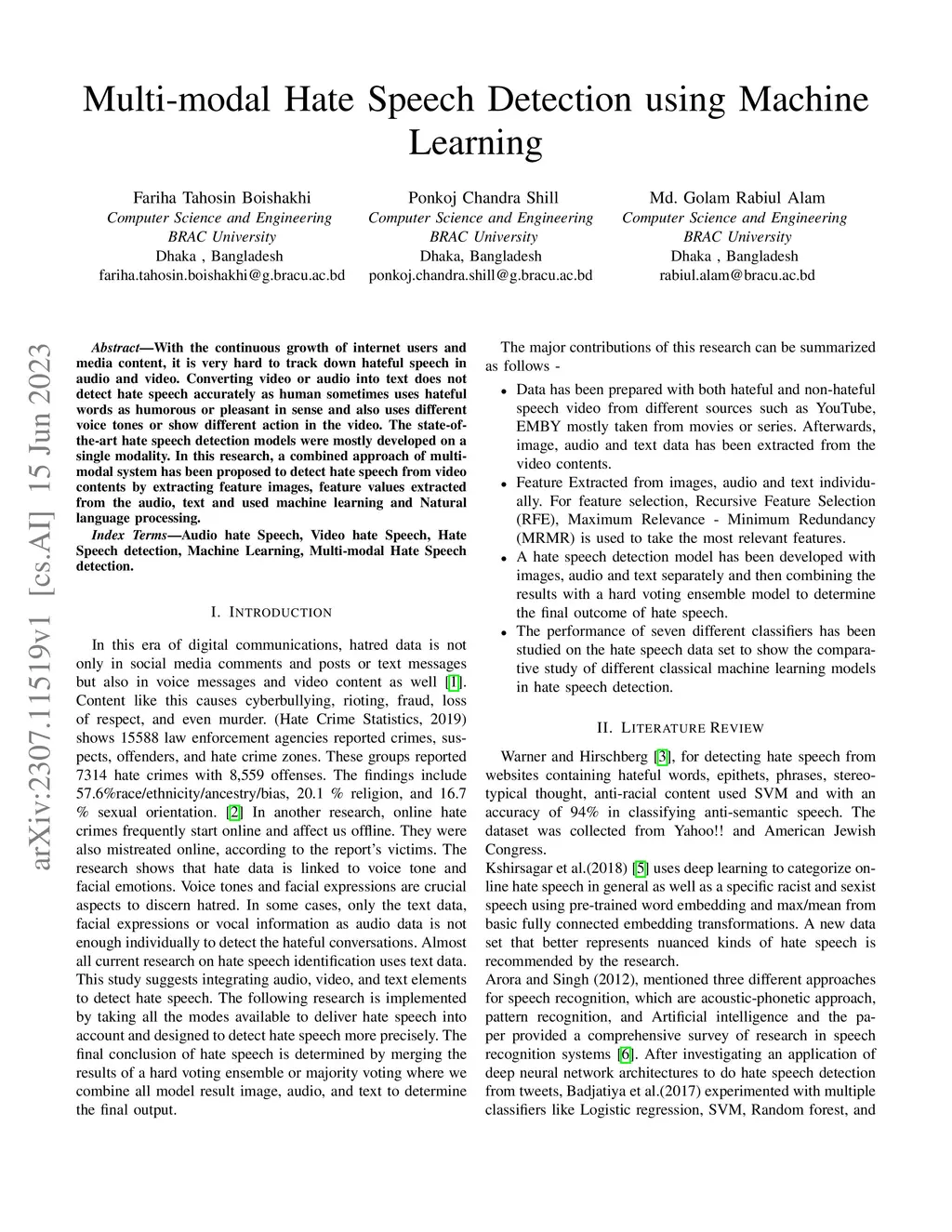 With the continuous growth of internet users and media content, it is very hard to track down hateful speech in audio and video. Converting video or audio into text does not detect hate speech accurately as human sometimes uses hateful words as humorous or pleasant in sense and also uses different voice tones or show different action in the video. The state-ofthe-art hate speech detection models were mostly developed on a single modality. In this research, a combined approach of multimodal system has been proposed to detect hate speech from video contents by extracting feature images, feature values extracted from the audio, text and used machine learning and Natural language processing.