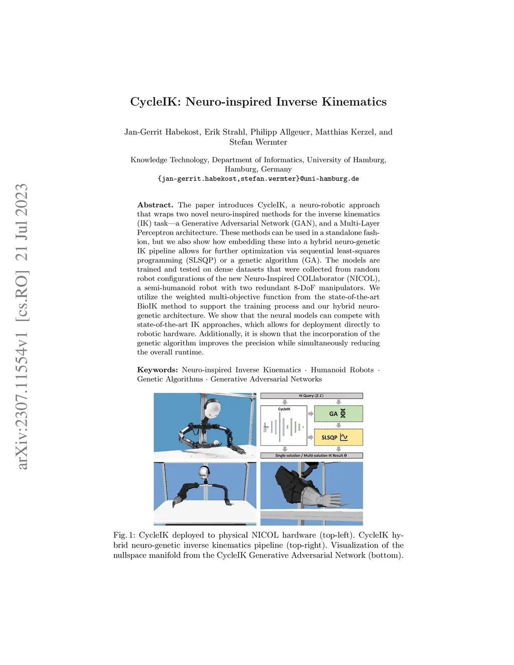 The paper introduces CycleIK, a neuro-robotic approach that wraps two novel neuro-inspired methods for the inverse kinematics (IK) task, a Generative Adversarial Network (GAN), and a Multi-Layer Perceptron architecture. These methods can be used in a standalone fashion, but we also show how embedding these into a hybrid neuro-genetic IK pipeline allows for further optimization via sequential least-squares programming (SLSQP) or a genetic algorithm (GA). The models are trained and tested on dense datasets that were collected from random robot configurations of the new Neuro-Inspired COLlaborator (NICOL), a semi-humanoid robot with two redundant 8-DoF manipulators. We utilize the weighted multi-objective function from the state-of-the-art BioIK method to support the training process and our hybrid neuro-genetic architecture. We show that the neural models can compete with state-of-the-art IK approaches, which allows for deployment directly to robotic hardware. Additionally, it is shown that the incorporation of the genetic algorithm improves the precision while simultaneously reducing the overall runtime.