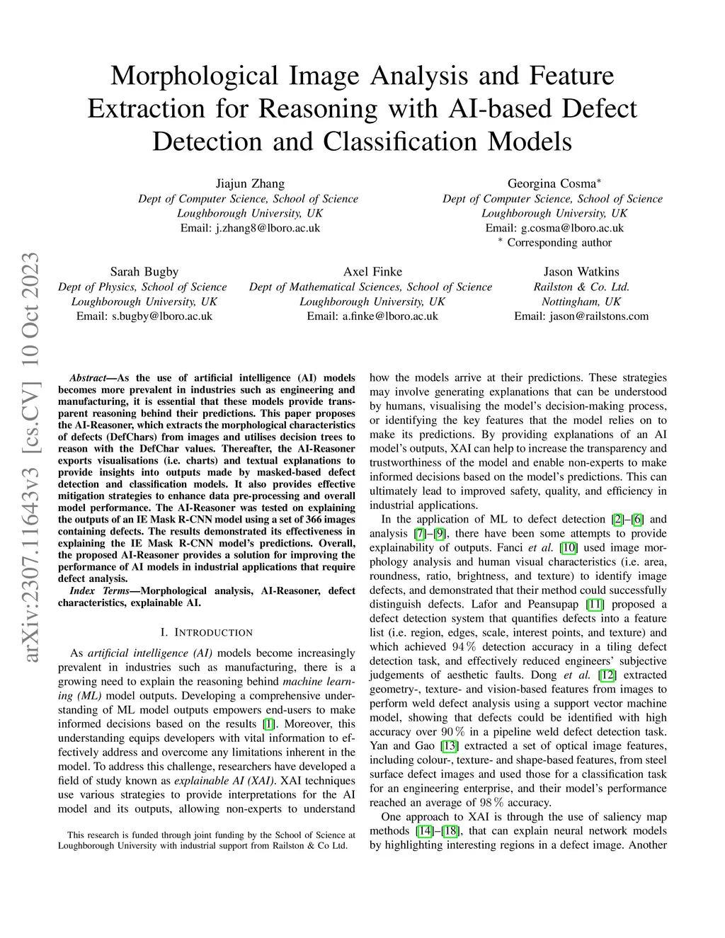 As the use of artificial intelligent (AI) models becomes more prevalent in industries such as engineering and manufacturing, it is essential that these models provide transparent reasoning behind their predictions. This paper proposes the AI-Reasoner, which extracts the morphological characteristics of defects (DefChars) from images and utilises decision trees to reason with the DefChar values. Thereafter, the AI-Reasoner exports visualisations (i.e. charts) and textual explanations to provide insights into outputs made by masked-based defect detection and classification models. It also provides effective mitigation strategies to enhance data pre-processing and overall model performance. The AI-Reasoner was tested on explaining the outputs of an IE Mask R-CNN model using a set of 366 images containing defects. The results demonstrated its effectiveness in explaining the IE Mask R-CNN model's predictions. Overall, the proposed AI-Reasoner provides a solution for improving the performance of AI models in industrial applications that require defect analysis.