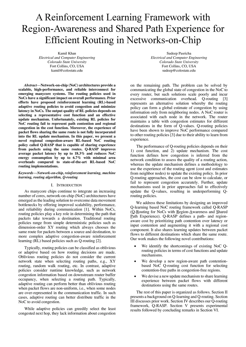 Network-on-chip (NoC) architectures provide a scalable, high-performance, and reliable interconnect for emerging manycore systems. The routing policies used in NoCs have a significant impact on overall performance. Prior efforts have proposed reinforcement learning (RL)-based adaptive routing policies to avoid congestion and minimize latency in NoCs. The output quality of RL policies depends on selecting a representative cost function and an effective update mechanism. Unfortunately, existing RL policies for NoC routing fail to represent path contention and regional congestion in the cost function. Moreover, the experience of packet flows sharing the same route is not fully incorporated into the RL update mechanism. In this paper, we present a novel regional congestion-aware RL-based NoC routing policy called Q-RASP that is capable of sharing experience from packets using the same routes. Q-RASP improves average packet latency by up to 18.3% and reduces NoC energy consumption by up to 6.7% with minimal area overheads compared to state-of-the-art RL-based NoC routing implementations.