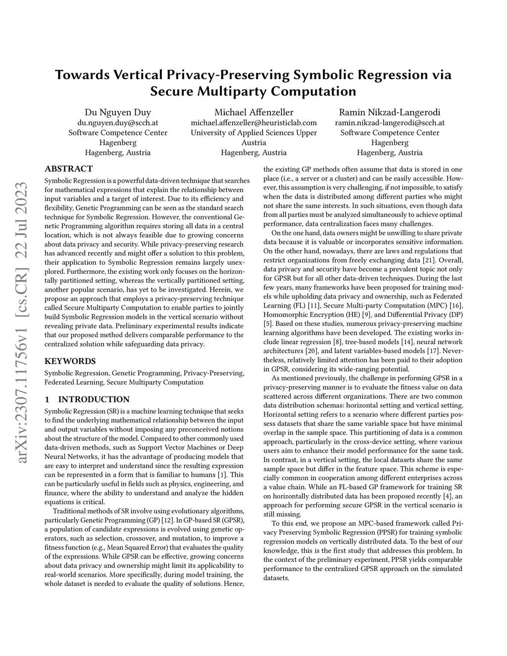 Symbolic Regression is a powerful data-driven technique that searches for mathematical expressions that explain the relationship between input variables and a target of interest. Due to its efficiency and flexibility, Genetic Programming can be seen as the standard search technique for Symbolic Regression. However, the conventional Genetic Programming algorithm requires storing all data in a central location, which is not always feasible due to growing concerns about data privacy and security. While privacy-preserving research has advanced recently and might offer a solution to this problem, their application to Symbolic Regression remains largely unexplored. Furthermore, the existing work only focuses on the horizontally partitioned setting, whereas the vertically partitioned setting, another popular scenario, has yet to be investigated. Herein, we propose an approach that employs a privacy-preserving technique called Secure Multiparty Computation to enable parties to jointly build Symbolic Regression models in the vertical scenario without revealing private data. Preliminary experimental results indicate that our proposed method delivers comparable performance to the centralized solution while safeguarding data privacy.