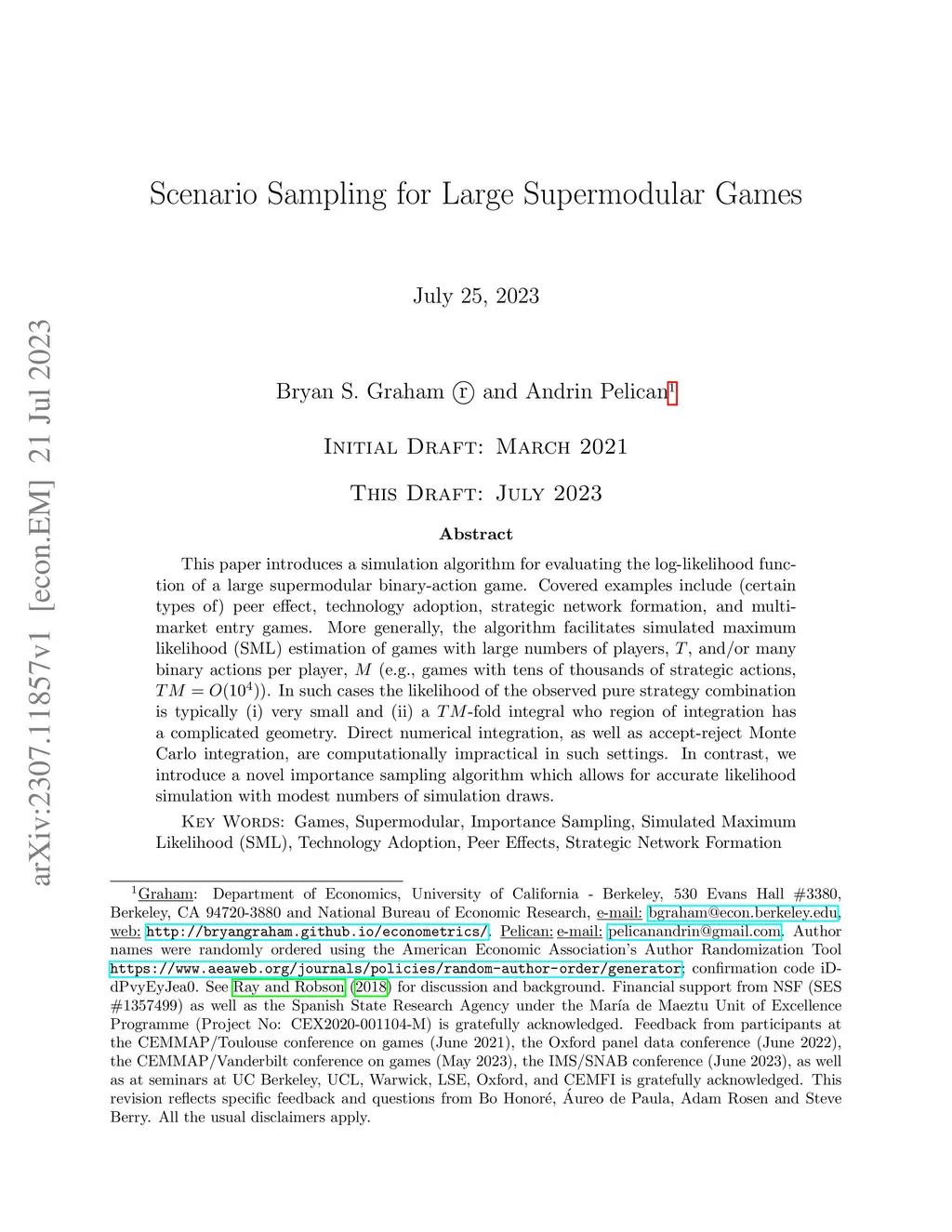 This paper introduces a simulation algorithm for evaluating the log-likelihood function of a large supermodular binary-action game. Covered examples include (certain types of) peer effect, technology adoption, strategic network formation, and multi-market entry games. More generally, the algorithm facilitates simulated maximum likelihood (SML) estimation of games with large numbers of players, , and/or many binary actions per player, (e.g., games with tens of thousands of strategic actions, ). In such cases the likelihood of the observed pure strategy combination is typically (i) very small and (ii) a -fold integral who region of integration has a complicated geometry. Direct numerical integration, as well as accept-reject Monte Carlo integration, are computationally impractical in such settings. In contrast, we introduce a novel importance sampling algorithm which allows for accurate likelihood simulation with modest numbers of simulation draws.