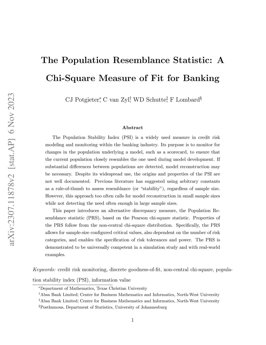The Population Stability Index (PSI) is a widely used measure in credit risk modeling and monitoring within the banking industry. Its purpose is to monitor for changes in the population underlying a model, such as a scorecard, to ensure that the current population closely resembles the one used during model development. If substantial differences between populations are detected, model reconstruction may be necessary. Despite its widespread use, the origins and properties of the PSI are not well documented. Previous literature has suggested using arbitrary constants as a rule-of-thumb to assess stability, regardless of sample size. However, this approach too often calls for model reconstruction in small sample sizes while not detecting the need often enough in large sample sizes. This paper introduces an alternative discrepancy measure called the Population Resemblance statistic (PRS). It is based on the Pearson chi-square statistic. Properties of the PRS follow from the non-central chi-square distribution. Notably, the PRS accommodates sample-size dependent critical values and enables the specification of risk tolerances. Its efficacy is demonstrated in a simulation study and with real-world examples.
