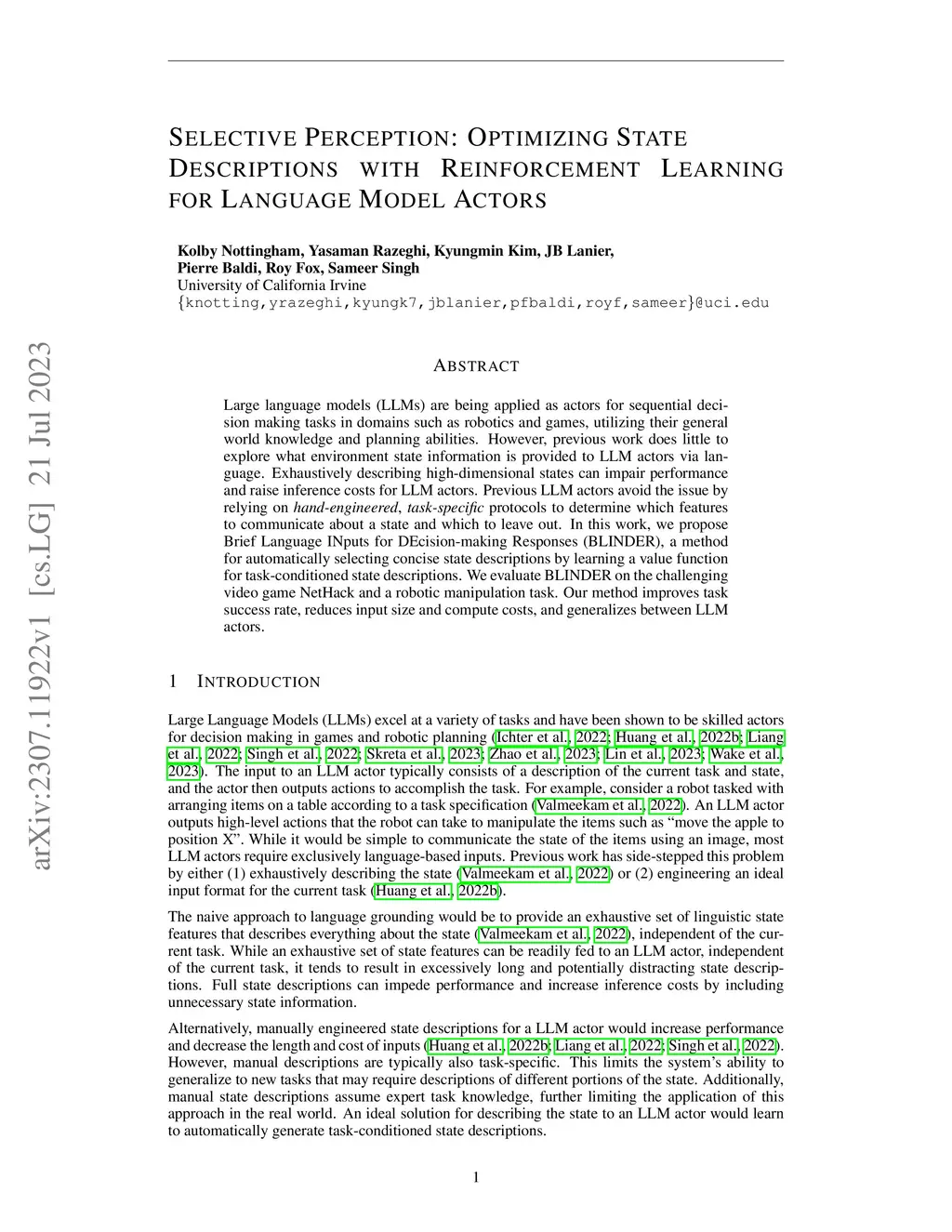 Large language models (LLMs) are being applied as actors for sequential decision making tasks in domains such as robotics and games, utilizing their general world knowledge and planning abilities. However, previous work does little to explore what environment state information is provided to LLM actors via language. Exhaustively describing high-dimensional states can impair performance and raise inference costs for LLM actors. Previous LLM actors avoid the issue by relying on hand-engineered, task-specific protocols to determine which features to communicate about a state and which to leave out. In this work, we propose Brief Language INputs for DEcision-making Responses (BLINDER), a method for automatically selecting concise state descriptions by learning a value function for task-conditioned state descriptions. We evaluate BLINDER on the challenging video game NetHack and a robotic manipulation task. Our method improves task success rate, reduces input size and compute costs, and generalizes between LLM actors.