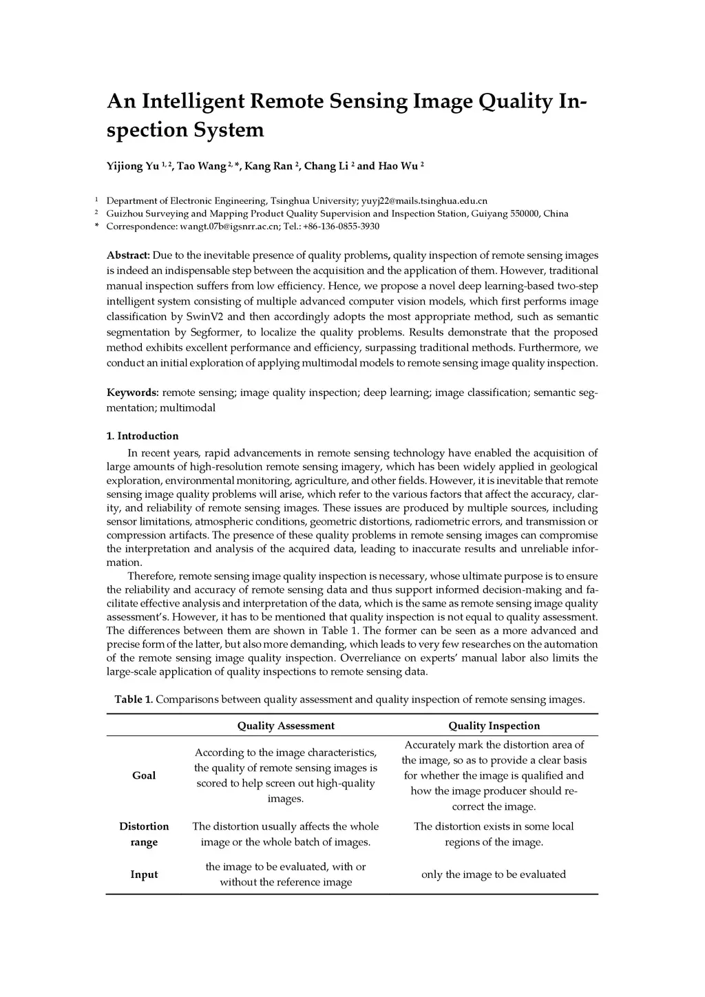 Due to the inevitable presence of quality problems, quality inspection of remote sensing images is indeed an indispensable step between the acquisition and the application of them. However, traditional manual inspection suffers from low efficiency. Hence, we propose a novel deep learning-based two-step intelligent system consisting of multiple advanced computer vision models, which first performs image classification by SwinV2 and then accordingly adopts the most appropriate method, such as semantic segmentation by Segformer, to localize the quality problems. Results demonstrate that the proposed method exhibits excellent performance and efficiency, surpassing traditional methods. Furthermore, we conduct an initial exploration of applying multimodal models to remote sensing image quality inspection.