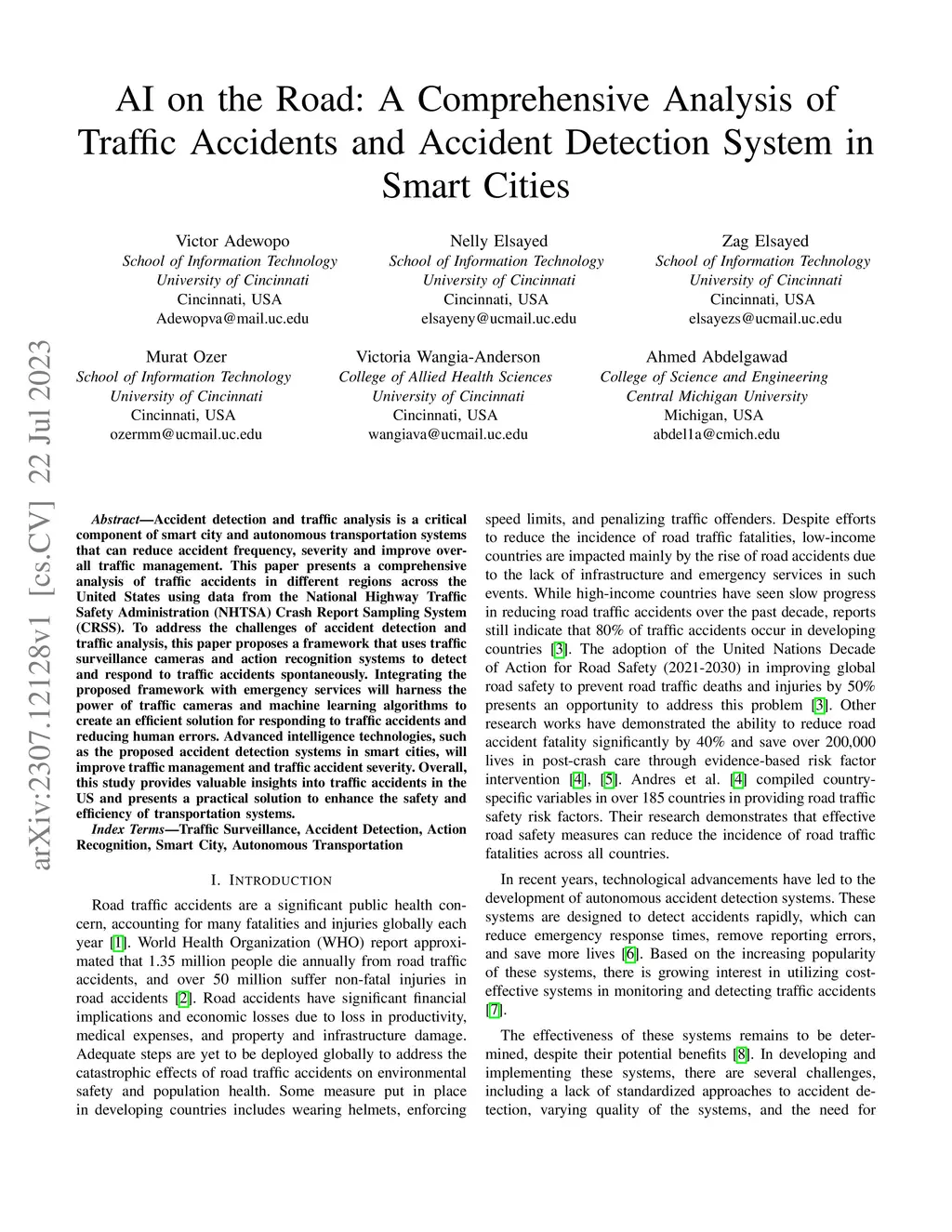 Accident detection and traffic analysis is a critical component of smart city and autonomous transportation systems that can reduce accident frequency, severity and improve overall traffic management. This paper presents a comprehensive analysis of traffic accidents in different regions across the United States using data from the National Highway Traffic Safety Administration (NHTSA) Crash Report Sampling System (CRSS). To address the challenges of accident detection and traffic analysis, this paper proposes a framework that uses traffic surveillance cameras and action recognition systems to detect and respond to traffic accidents spontaneously. Integrating the proposed framework with emergency services will harness the power of traffic cameras and machine learning algorithms to create an efficient solution for responding to traffic accidents and reducing human errors. Advanced intelligence technologies, such as the proposed accident detection systems in smart cities, will improve traffic management and traffic accident severity. Overall, this study provides valuable insights into traffic accidents in the US and presents a practical solution to enhance the safety and efficiency of transportation systems.
