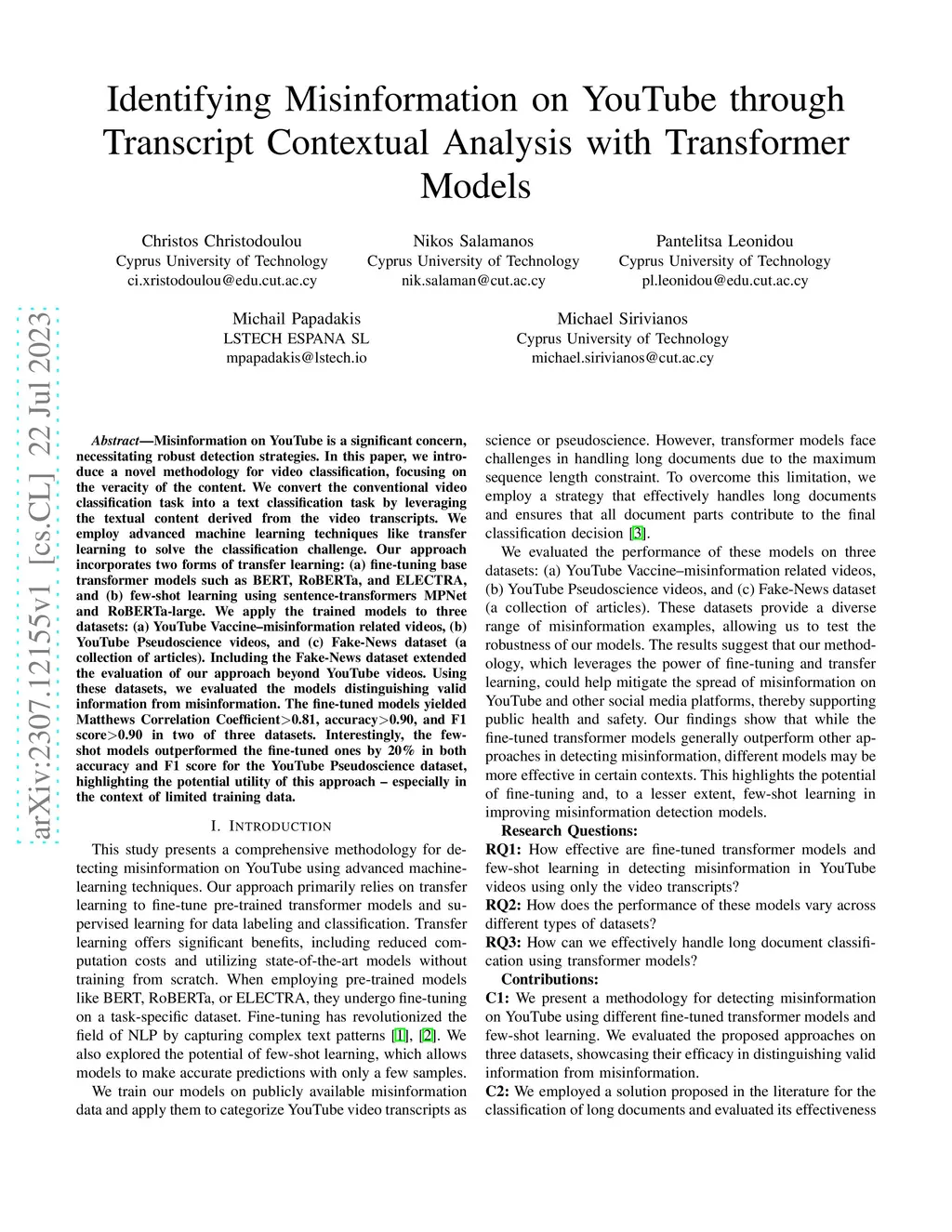 Misinformation on YouTube is a significant concern, necessitating robust detection strategies. In this paper, we introduce a novel methodology for video classification, focusing on the veracity of the content. We convert the conventional video classification task into a text classification task by leveraging the textual content derived from the video transcripts. We employ advanced machine learning techniques like transfer learning to solve the classification challenge. Our approach incorporates two forms of transfer learning: (a) fine-tuning base transformer models such as BERT, RoBERTa, and ELECTRA, and (b) few-shot learning using sentence-transformers MPNet and RoBERTa-large. We apply the trained models to three datasets: (a) YouTube Vaccine-misinformation related videos, (b) YouTube Pseudoscience videos, and (c) Fake-News dataset (a collection of articles). Including the Fake-News dataset extended the evaluation of our approach beyond YouTube videos. Using these datasets, we evaluated the models distinguishing valid information from misinformation. The fine-tuned models yielded Matthews Correlation Coefficient>0.81, accuracy>0.90, and F1 score>0.90 in two of three datasets. Interestingly, the few-shot models outperformed the fine-tuned ones by 20% in both Accuracy and F1 score for the YouTube Pseudoscience dataset, highlighting the potential utility of this approach -- especially in the context of limited training data.