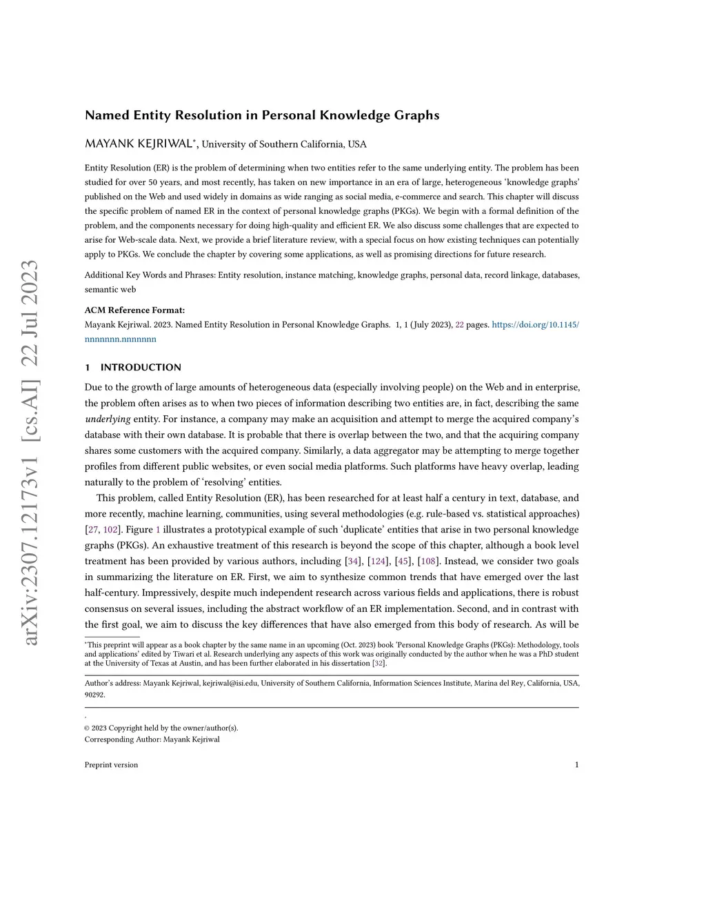 Entity Resolution (ER) is the problem of determining when two entities refer to the same underlying entity. The problem has been studied for over 50 years, and most recently, has taken on new importance in an era of large, heterogeneous 'knowledge graphs' published on the Web and used widely in domains as wide ranging as social media, e-commerce and search. This chapter will discuss the specific problem of named ER in the context of personal knowledge graphs (PKGs). We begin with a formal definition of the problem, and the components necessary for doing high-quality and efficient ER. We also discuss some challenges that are expected to arise for Web-scale data. Next, we provide a brief literature review, with a special focus on how existing techniques can potentially apply to PKGs. We conclude the chapter by covering some applications, as well as promising directions for future research.