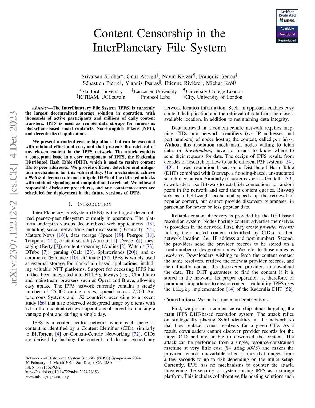 The InterPlanetary File System (IPFS) is currently the largest decentralized storage solution in operation, with thousands of active participants and millions of daily content transfers. IPFS is used as remote data storage for numerous blockchain-based smart contracts, Non-Fungible Tokens (NFT), and decentralized applications. We present a content censorship attack that can be executed with minimal effort and cost, and that prevents the retrieval of any chosen content in the IPFS network. The attack exploits a conceptual issue in a core component of IPFS, the Kademlia Distributed Hash Table (DHT), which is used to resolve content IDs to peer addresses. We provide efficient detection and mitigation mechanisms for this vulnerability. Our mechanisms achieve a 99.6\% detection rate and mitigate 100\% of the detected attacks with minimal signaling and computational overhead. We followed responsible disclosure procedures, and our countermeasures are scheduled for deployment in the future versions of IPFS.