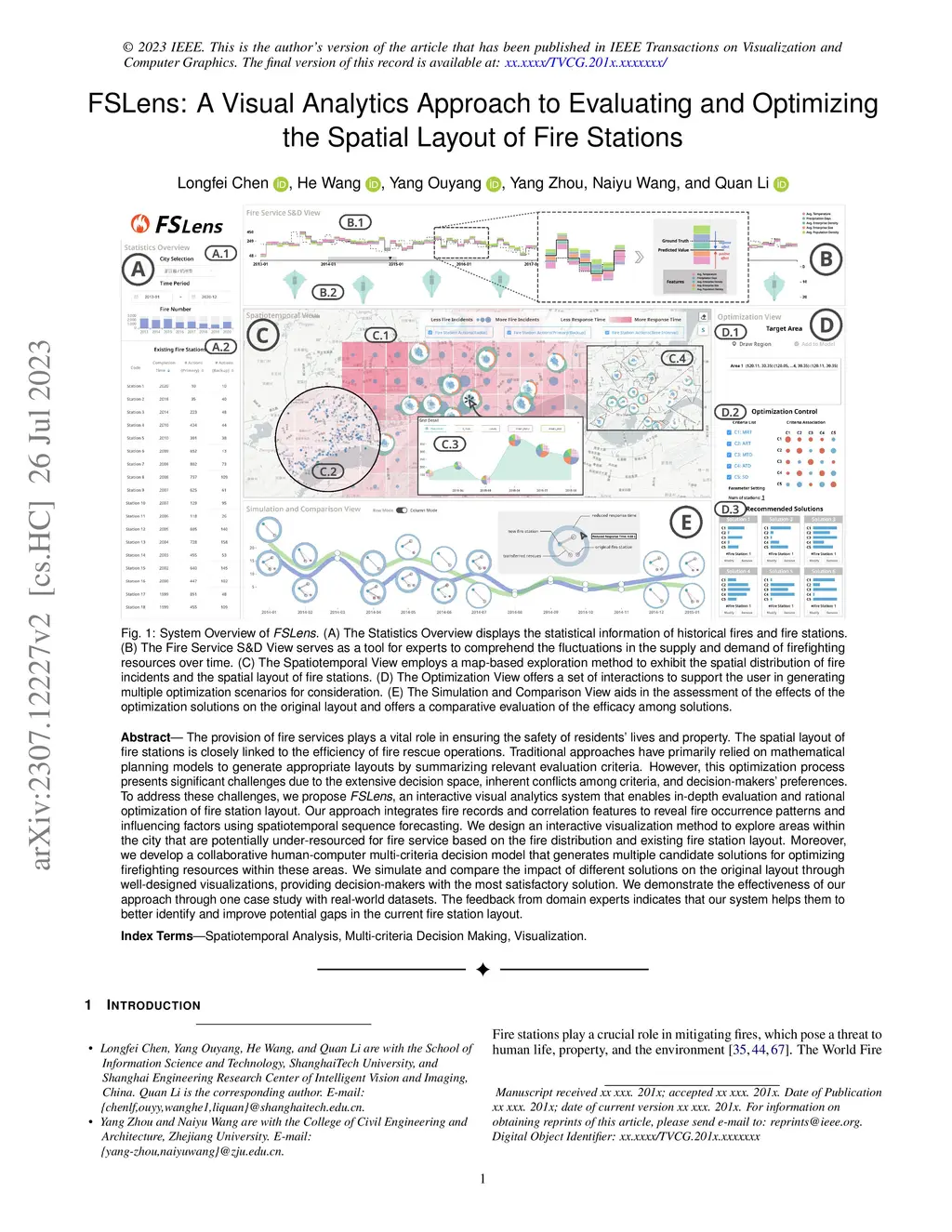 The provision of fire services plays a vital role in ensuring the safety of residents' lives and property. The spatial layout of fire stations is closely linked to the efficiency of fire rescue operations. Traditional approaches have primarily relied on mathematical planning models to generate appropriate layouts by summarizing relevant evaluation criteria. However, this optimization process presents significant challenges due to the extensive decision space, inherent conflicts among criteria, and decision-makers' preferences. To address these challenges, we propose FSLens, an interactive visual analytics system that enables in-depth evaluation and rational optimization of fire station layout. Our approach integrates fire records and correlation features to reveal fire occurrence patterns and influencing factors using spatiotemporal sequence forecasting. We design an interactive visualization method to explore areas within the city that are potentially under-resourced for fire service based on the fire distribution and existing fire station layout. Moreover, we develop a collaborative human-computer multi-criteria decision model that generates multiple candidate solutions for optimizing firefighting resources within these areas. We simulate and compare the impact of different solutions on the original layout through well-designed visualizations, providing decision-makers with the most satisfactory solution. We demonstrate the effectiveness of our approach through one case study with real-world datasets. The feedback from domain experts indicates that our system helps them to better identify and improve potential gaps in the current fire station layout.