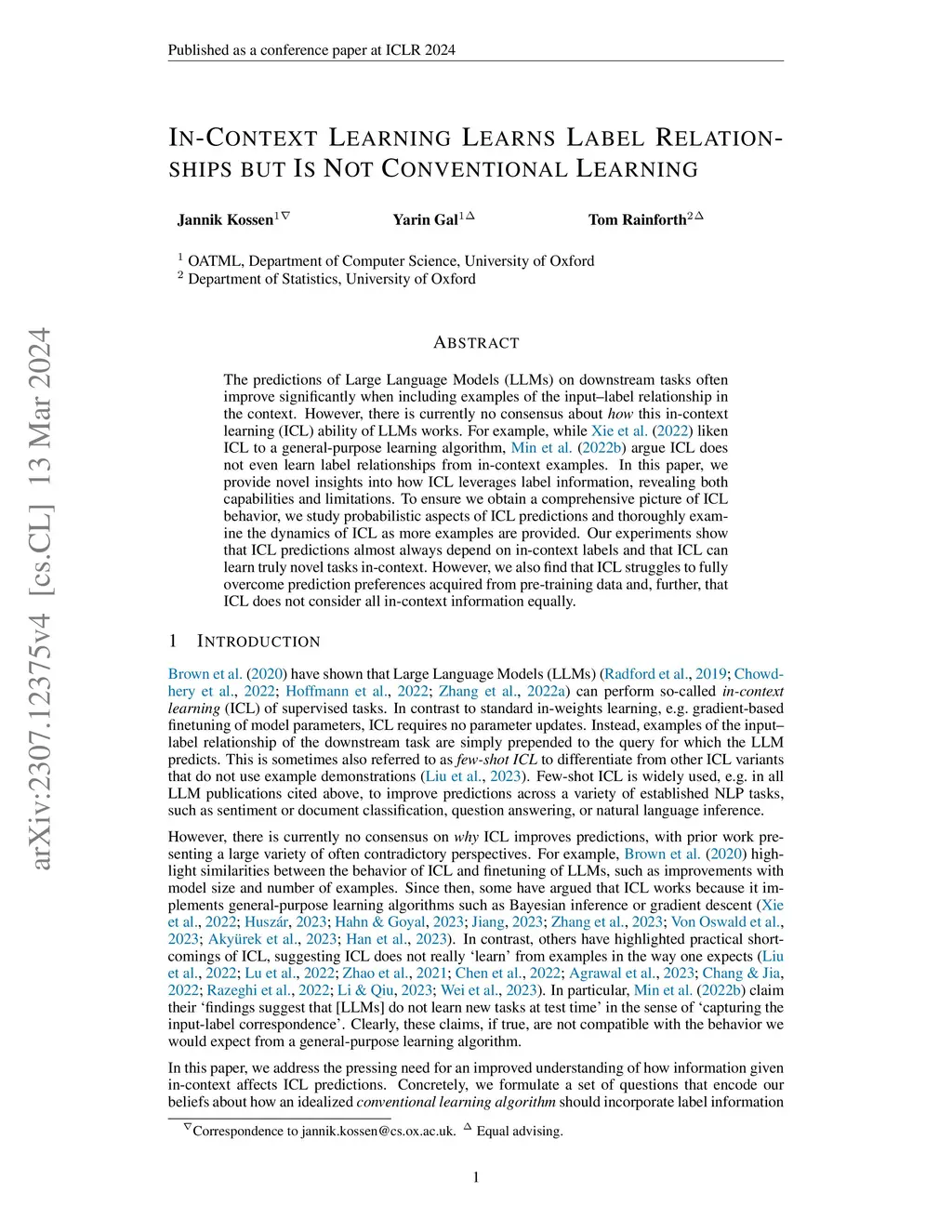 The predictions of Large Language Models (LLMs) on downstream tasks often improve significantly when including examples of the input--label relationship in the context. However, there is currently no consensus about how this in-context learning (ICL) ability of LLMs works. For example, while Xie et al. (2021) liken ICL to a general-purpose learning algorithm, Min et al. (2022) argue ICL does not even learn label relationships from in-context examples. In this paper, we provide novel insights into how ICL leverages label information, revealing both capabilities and limitations. To ensure we obtain a comprehensive picture of ICL behavior, we study probabilistic aspects of ICL predictions and thoroughly examine the dynamics of ICL as more examples are provided. Our experiments show that ICL predictions almost always depend on in-context labels and that ICL can learn truly novel tasks in-context. However, we also find that ICL struggles to fully overcome prediction preferences acquired from pre-training data and, further, that ICL does not consider all in-context information equally.