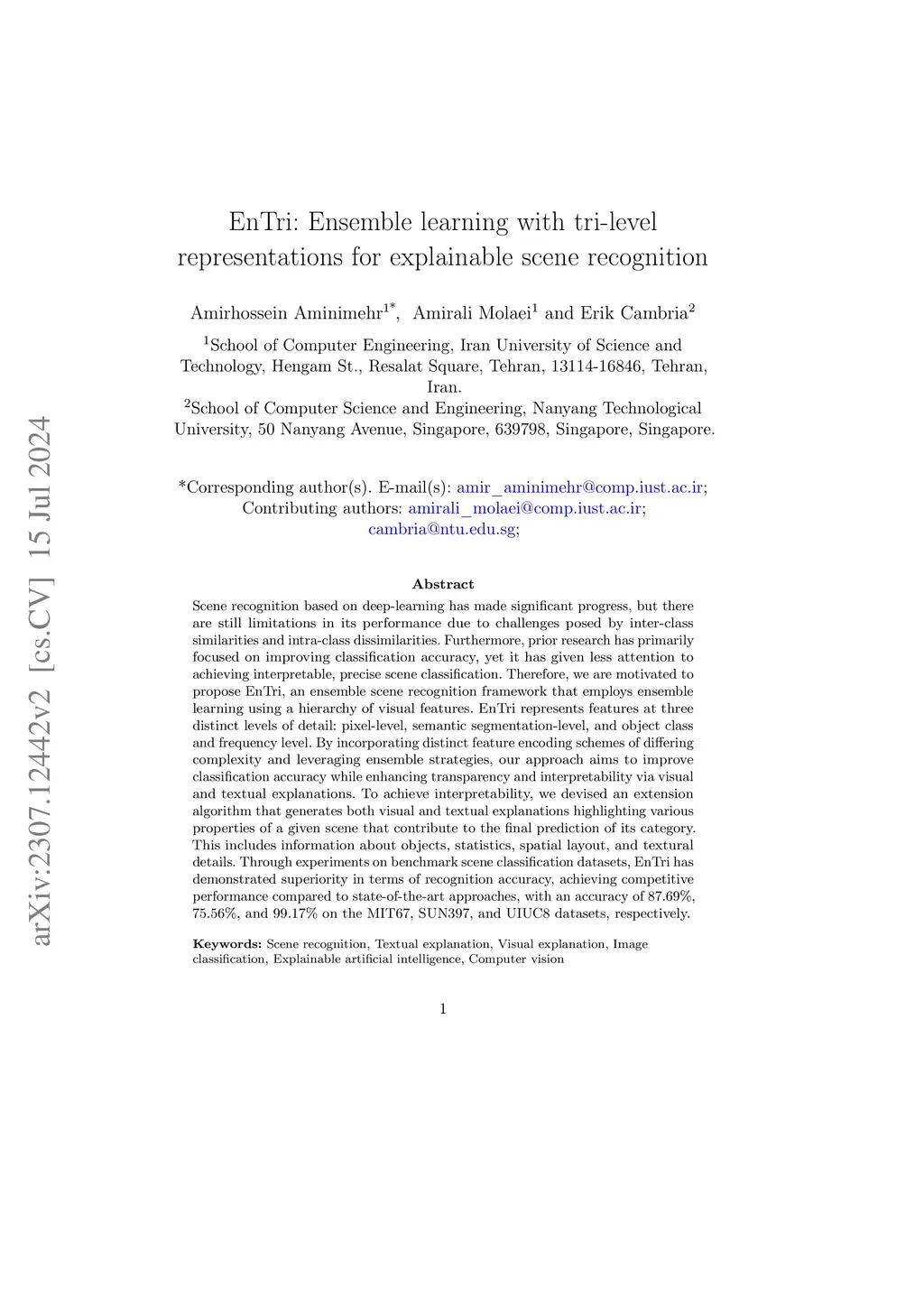 Scene recognition based on deep-learning has made significant progress, but there are still limitations in its performance due to challenges posed by inter-class similarities and intra-class dissimilarities. Furthermore, prior research has primarily focused on improving classification accuracy, yet it has given less attention to achieving interpretable, precise scene classification. Therefore, we are motivated to propose EnTri, an ensemble scene recognition framework that employs ensemble learning using a hierarchy of visual features. EnTri represents features at three distinct levels of detail: pixel-level, semantic segmentation-level, and object class and frequency level. By incorporating distinct feature encoding schemes of differing complexity and leveraging ensemble strategies, our approach aims to improve classification accuracy while enhancing transparency and interpretability via visual and textual explanations. To achieve interpretability, we devised an extension algorithm that generates both visual and textual explanations highlighting various properties of a given scene that contribute to the final prediction of its category. This includes information about objects, statistics, spatial layout, and textural details. Through experiments on benchmark scene classification datasets, EnTri has demonstrated superiority in terms of recognition accuracy, achieving competitive performance compared to state-of-the-art approaches, with an accuracy of 87.69%, 75.56%, and 99.17% on the MIT67, SUN397, and UIUC8 datasets, respectively.